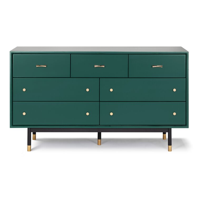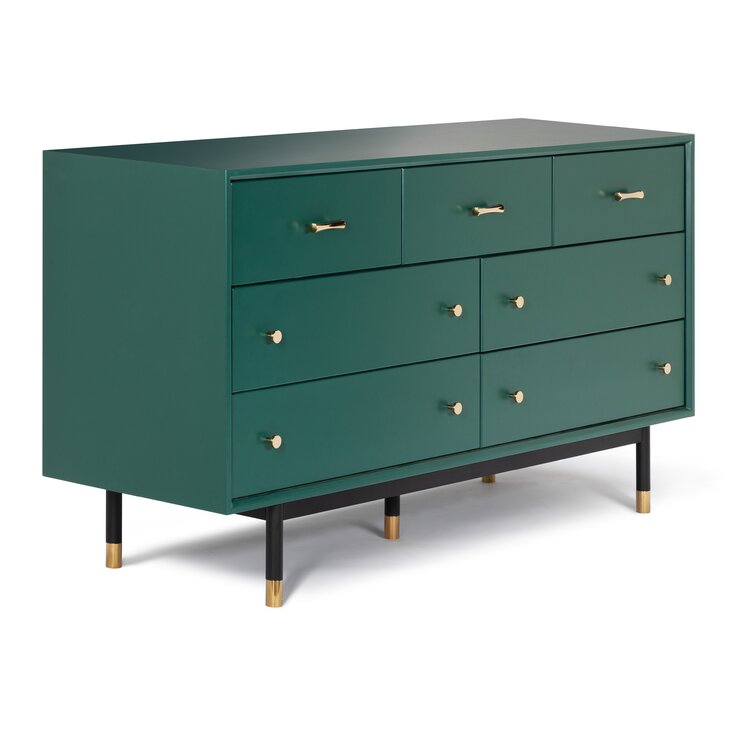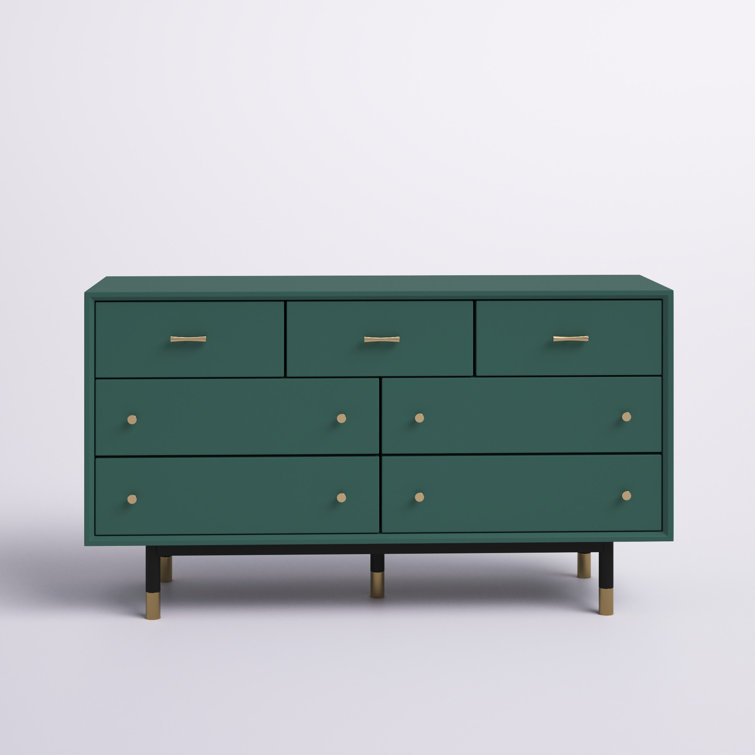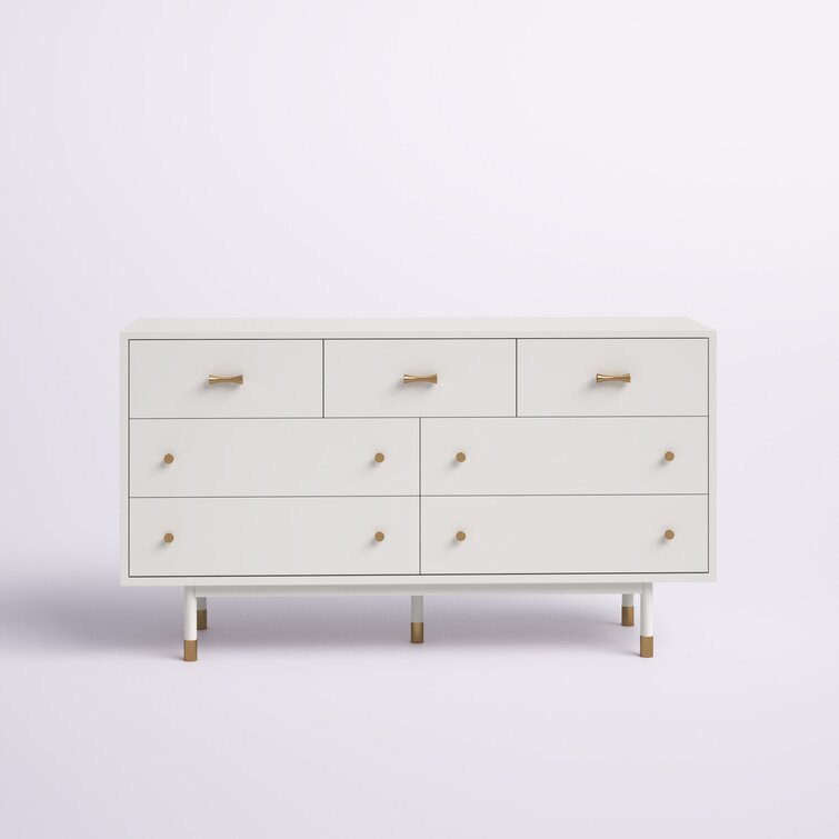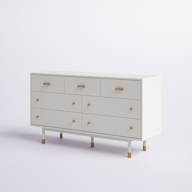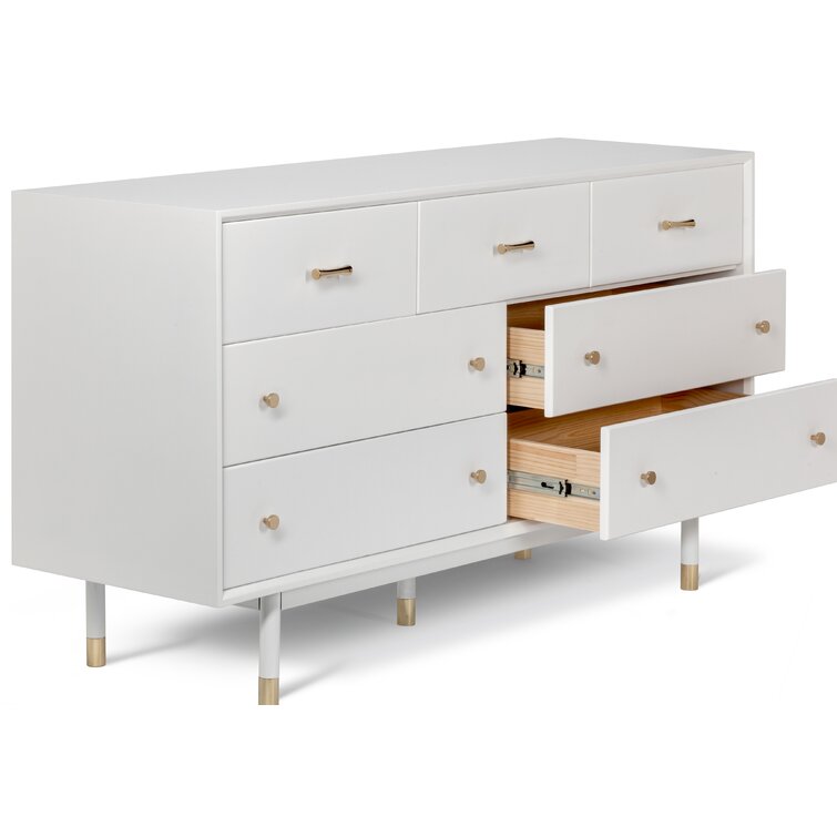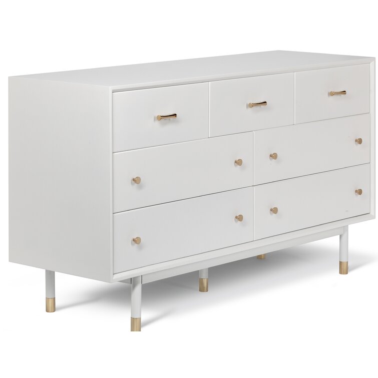 This 7-drawer dresser features clean lines and gold-capped feet for a glam and modern look in your bedroom. It's crafted from solid rubberwood with a chic, neutral finish, and it's built on five slender legs. The seven drawers feature gold handles for an extra layer of chic, and they each open up on ball-bearing glides to reveal room for clothes, extra bedding, and delicates. This dresser also has a spacious 60" wide surface that easily displays framed photos or a table lamp. Plus, it includes a tip-over restraint device for added safety.