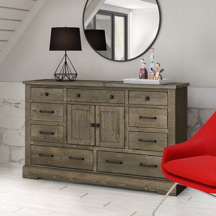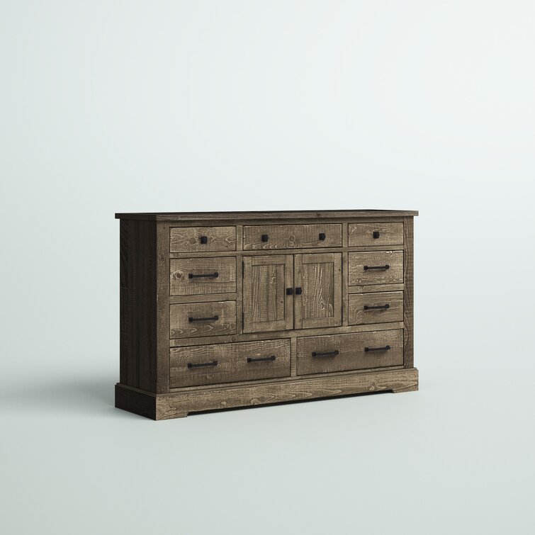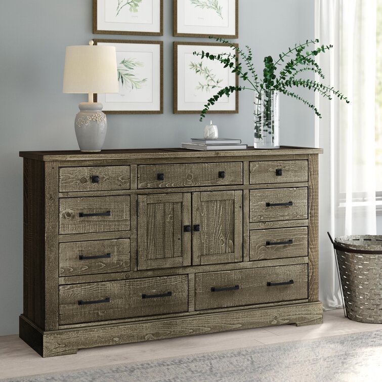 When it comes to your bedroom. storage space seems to always be at a premium C especially when it comes to your clothing. Don't worry. this dresser is here to help. Crafted from solid pine wood. it features nine pullout drawers on metal glides. ideal for tucking away the rest of your displaced wardrobe. Plus. awash in a weathered gray finish with graphite-hued hardware. this piece exudes rustic appeal in your arrangement.