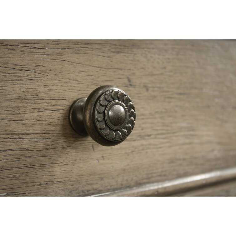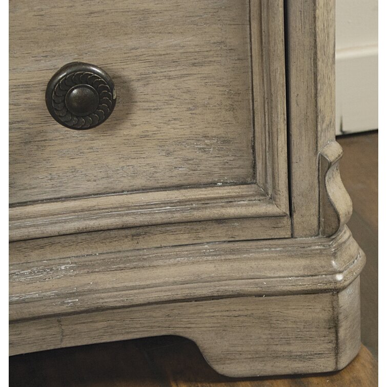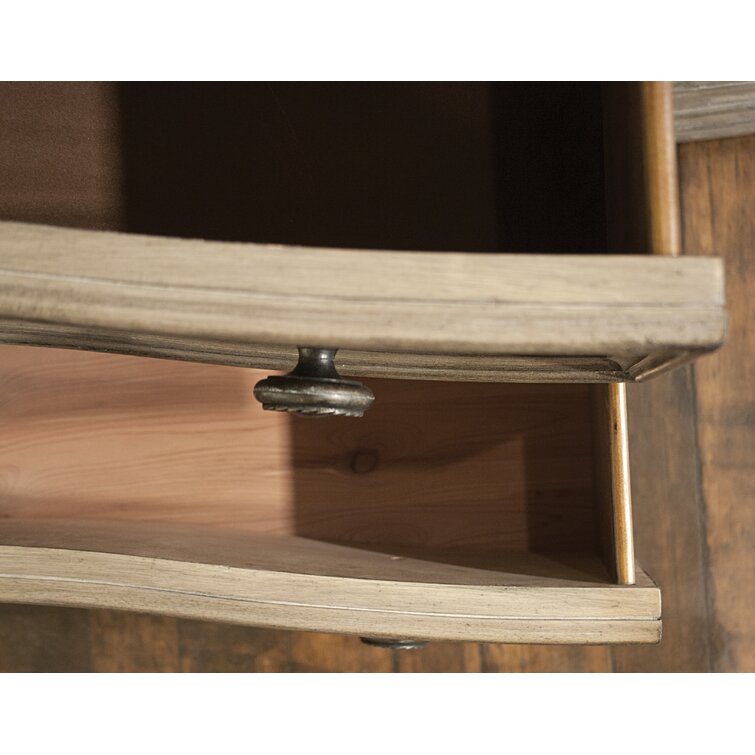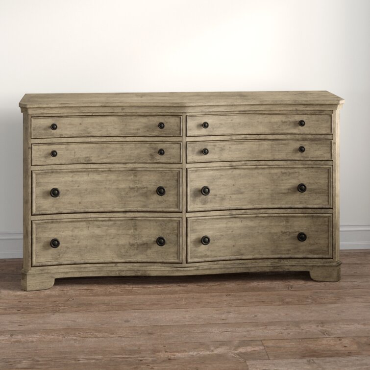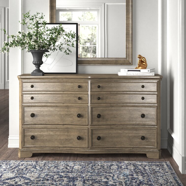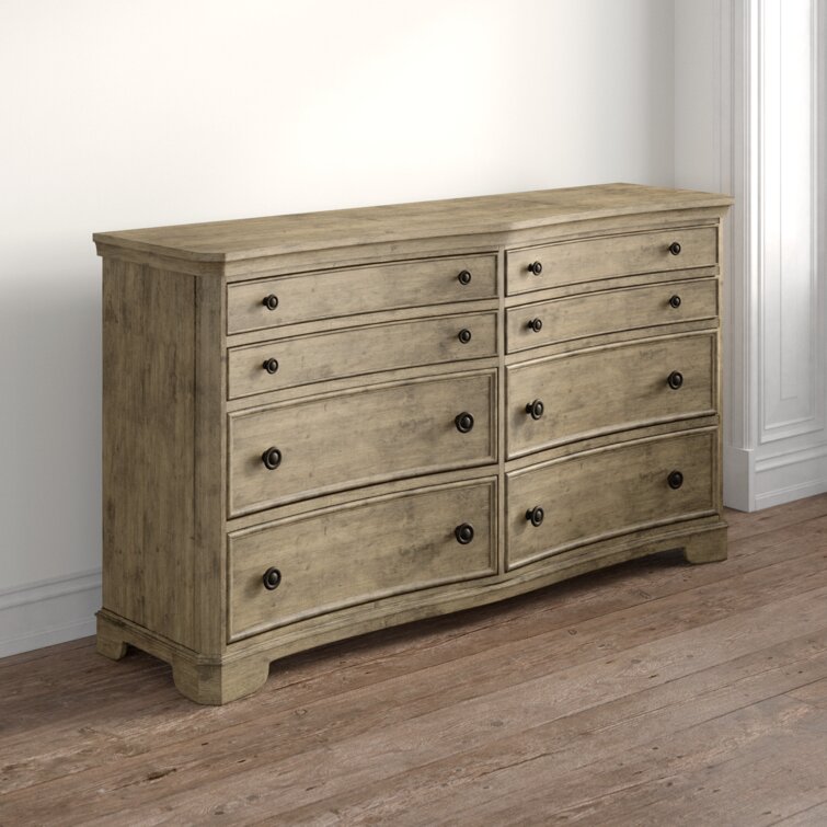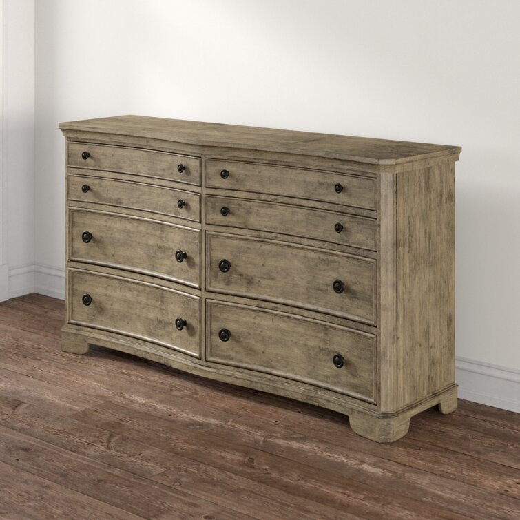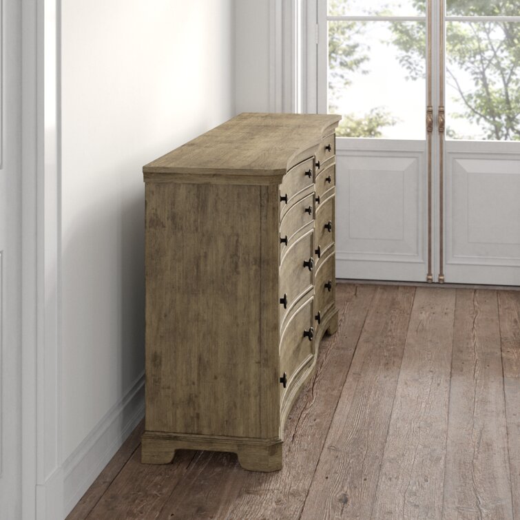 This 6-drawer double dresser brings some French country appeal to your bedroom, with its distinctive silhouette and contrast between hardware and finish. It's made from solid and engineered wood in a neutral finish, with wood grain color variation for a more natural-looking appearance. This dresser features molding and a concave front profile that gives it extra character. Six dovetailed drawers open to reveal plenty of space for your entire wardrobe, while the top two rows are felt-lined to protect more delicate items. There's also a wall anchor included for added safety.