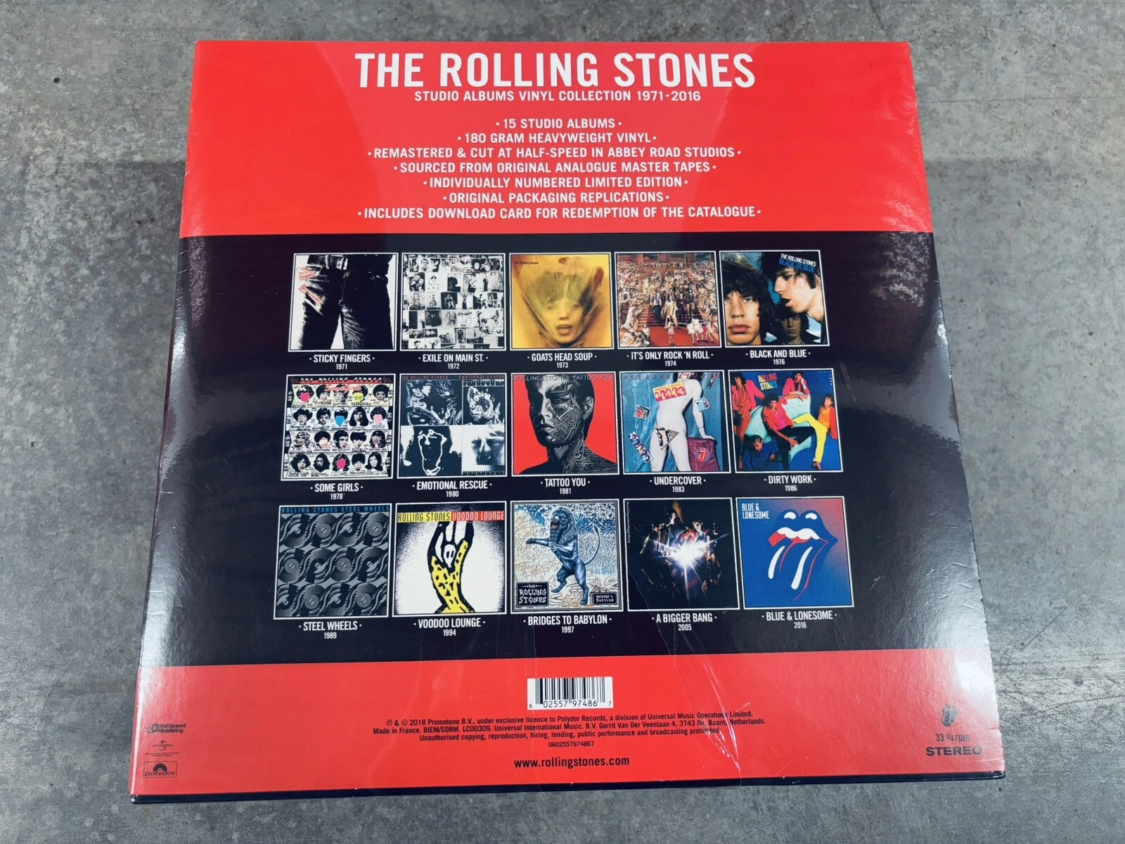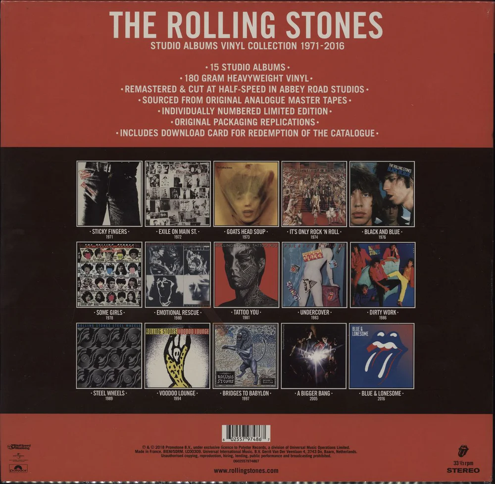 The Studio Albums Vinyl Collection 1971-2016 presents this monumental era in rocknroll history in a highly bespoke, lenticular mounted, limited edition box-set housing the 15 studio albums from Sticky Fingers through to Blue & Lonesome in faithful and intricate original packaging replications.