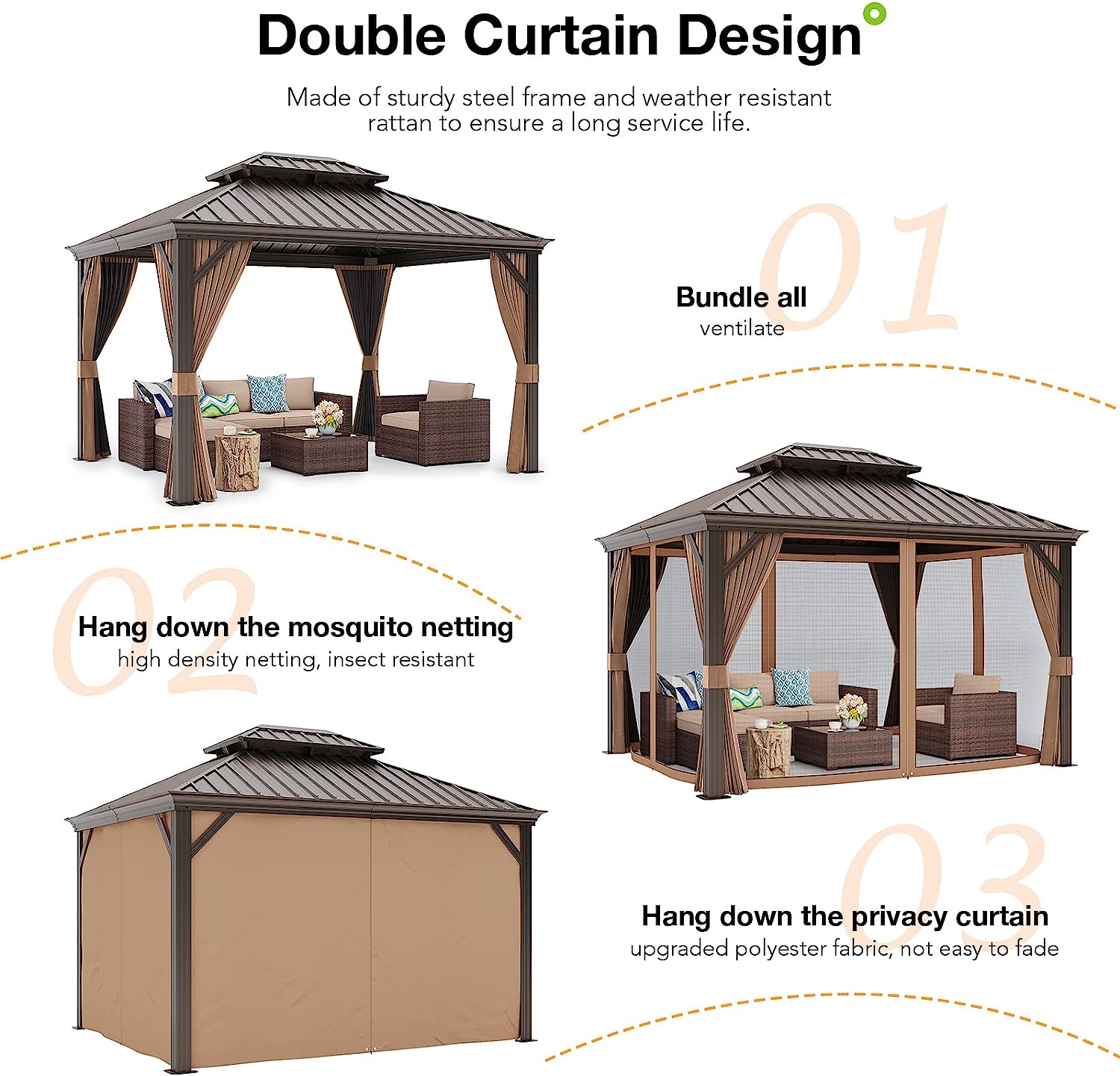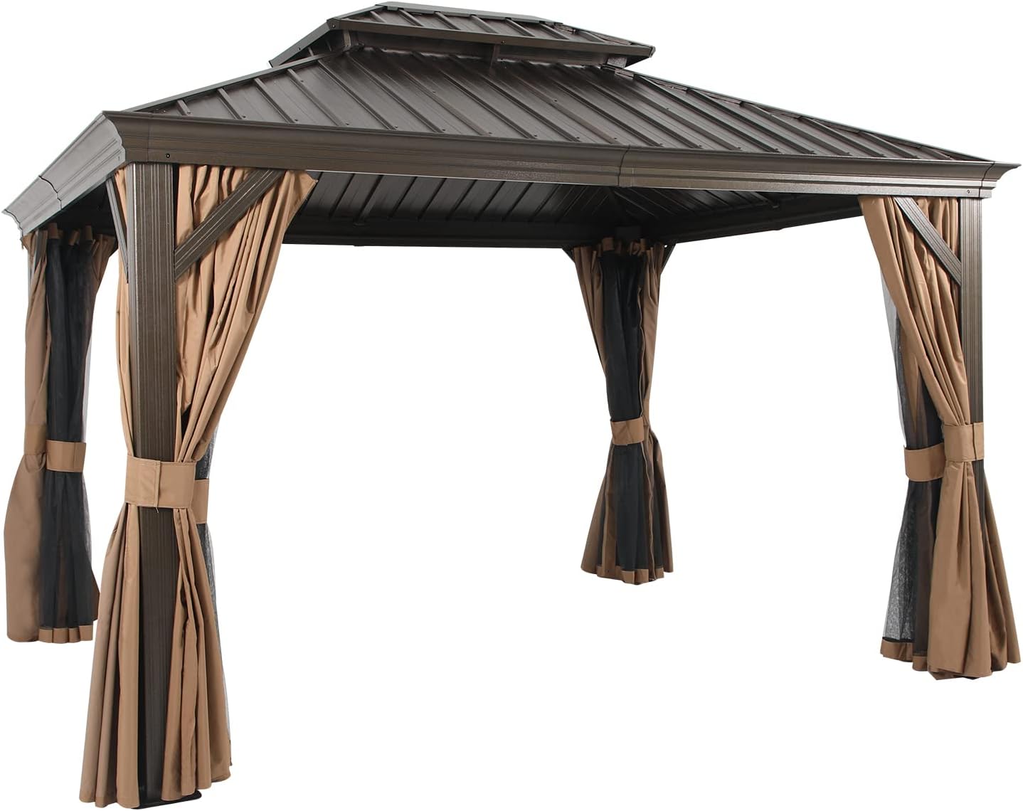 10'x12' Hardtop Gazebo, Outdoor Aluminum Gazebo with Galvanized Steel Double Vented Roof Canopy, W/Shaded Curtains and Netting, Pergola for Patio, Garden, Yard, Lawn,Party, BBQ