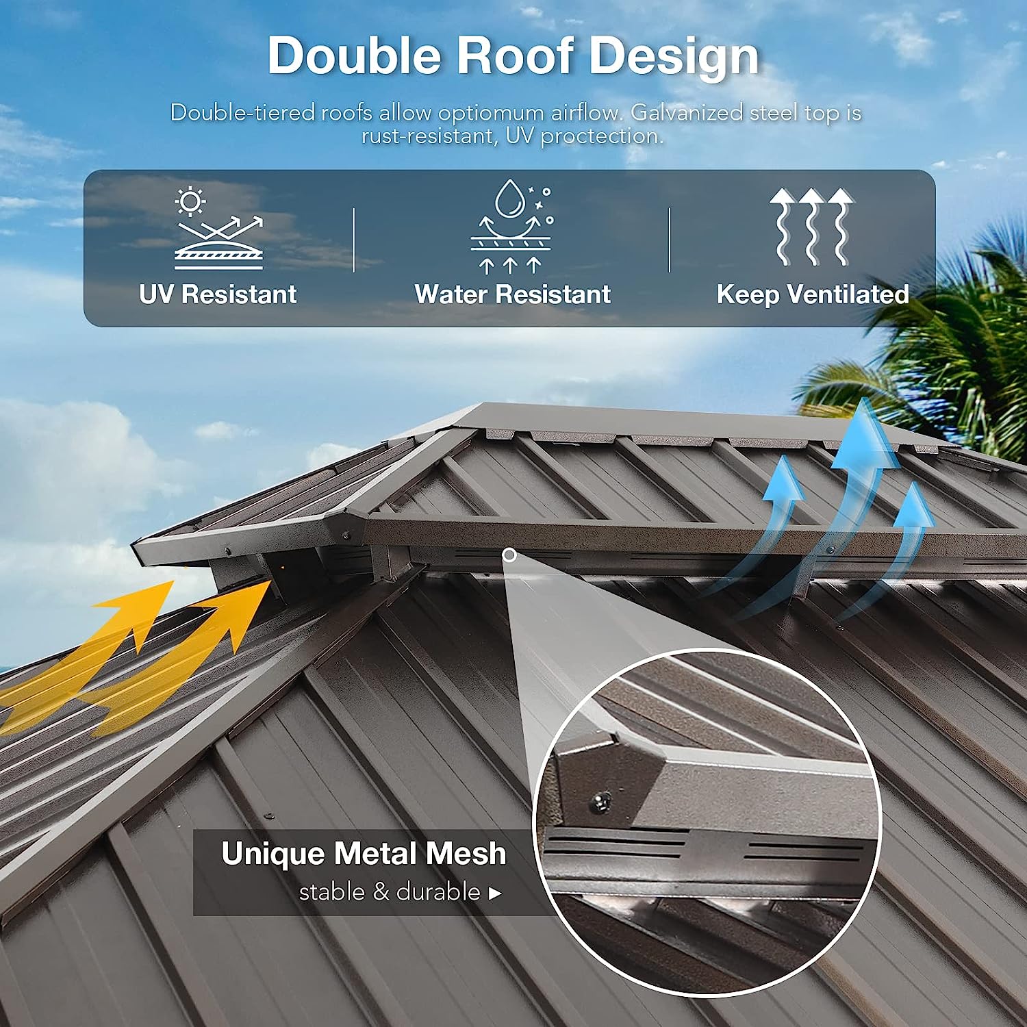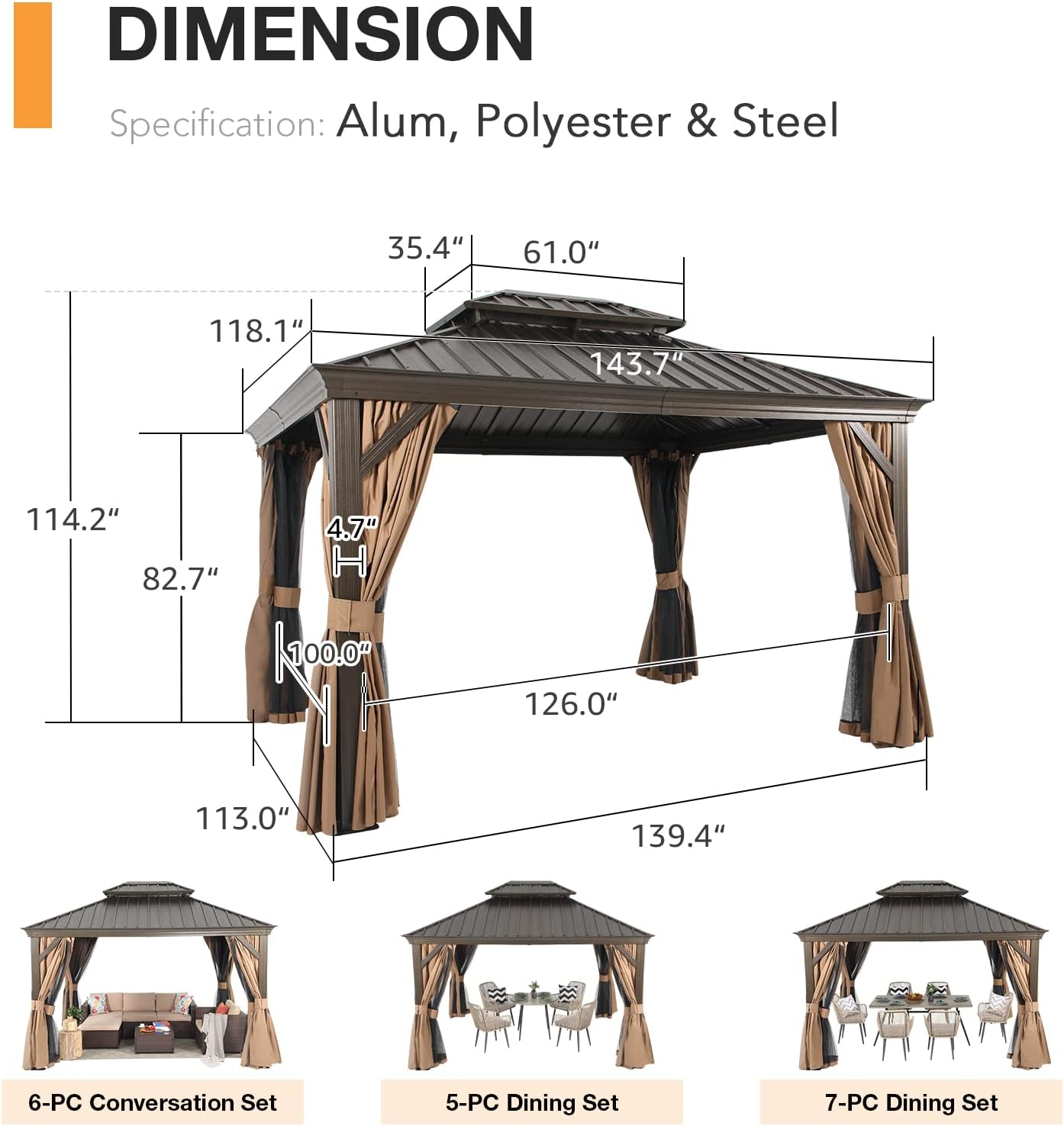 [Easy to Assemble]: Shipped in 4 boxes, this outdoor hard top gazebo comes with all the hardware, necessary tools, and easy-to-follow instructions for assembly. We recommend 2-5 people to complete it and it will take around 3-5 hours.