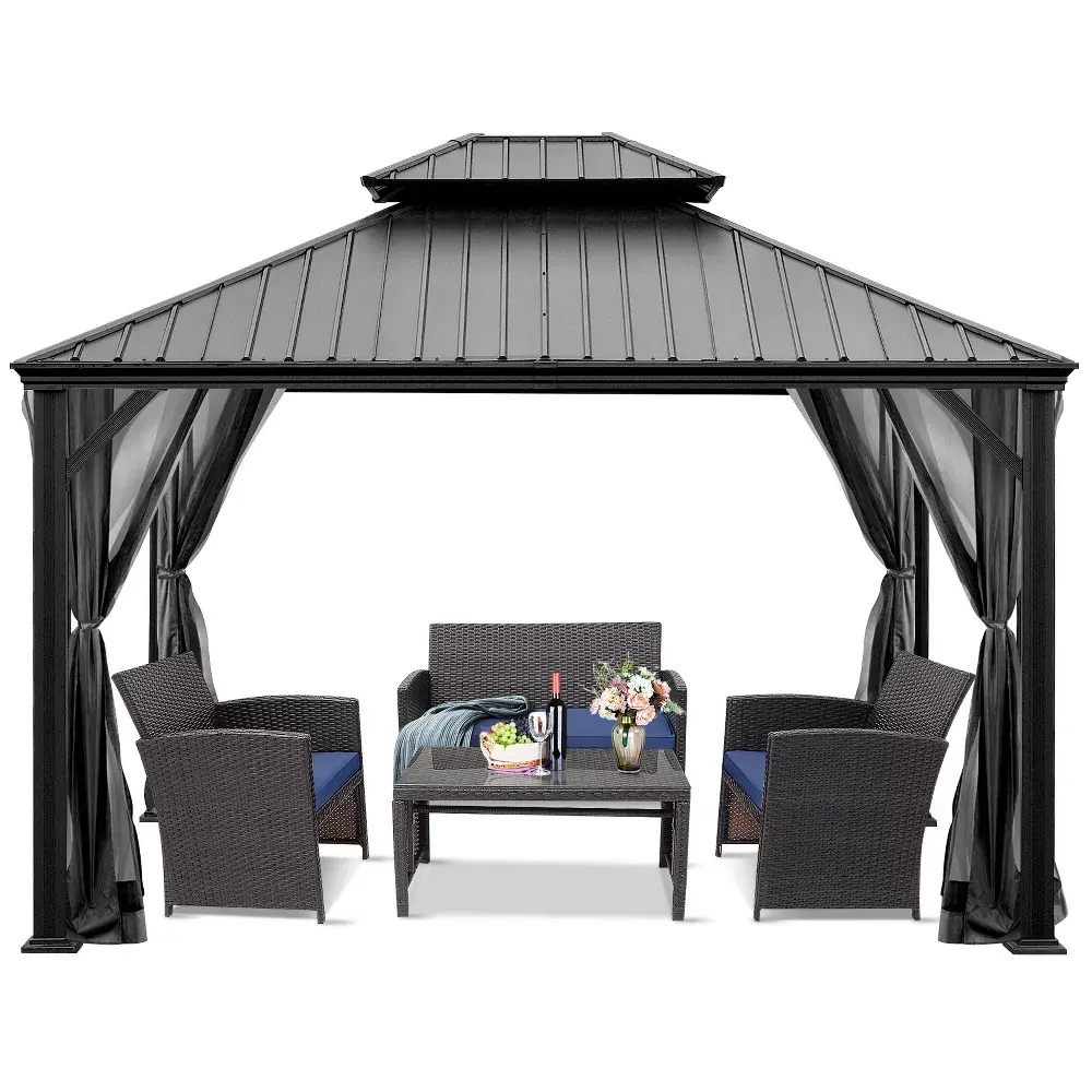 Do you want to create an comfortable oasis in your backyard? Our outdoor hardtop gazebo can help you to achieve the dream! This hardtop gazebo is large enough to cover 6-8 people at the same time, protecting you from annoying wind and sunlight. You can hold a barbecue party to share your happiness with family and friends. Made of heavy-duty steel frame, the double vented galvanized steel roof keeps good air flow and increase wind-resistance of the canopy. There is a built-in hanging hook on the roof. You can hang a small lamp or fan according to your needs. And 4 detachable mesh walls can be closed by zippered to keep privacy while keepingnice ventilation. Therefore, this durable hardtop sun shelter can work for you for years to come.