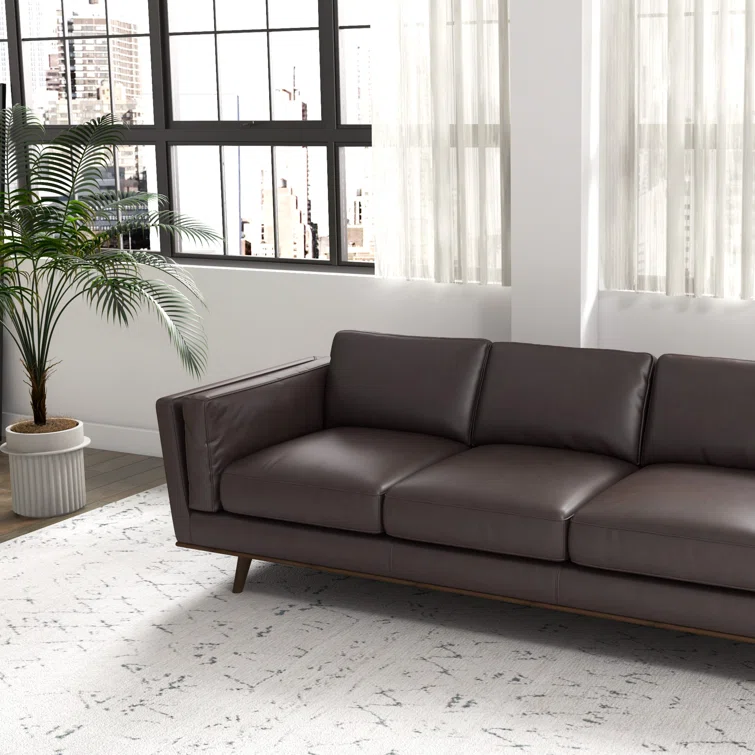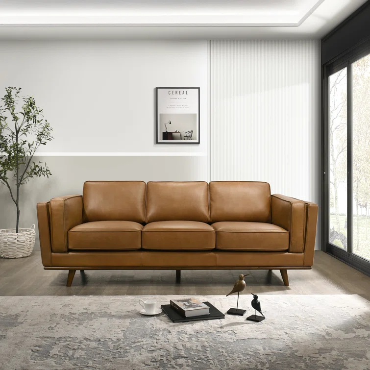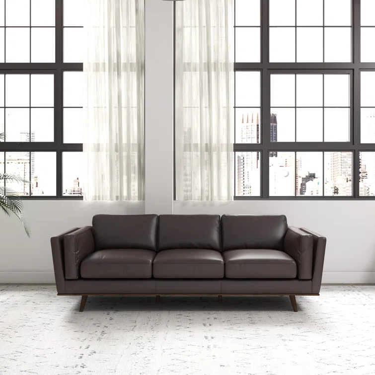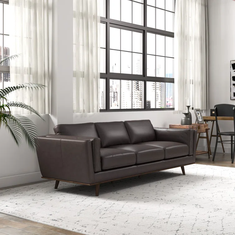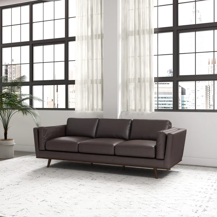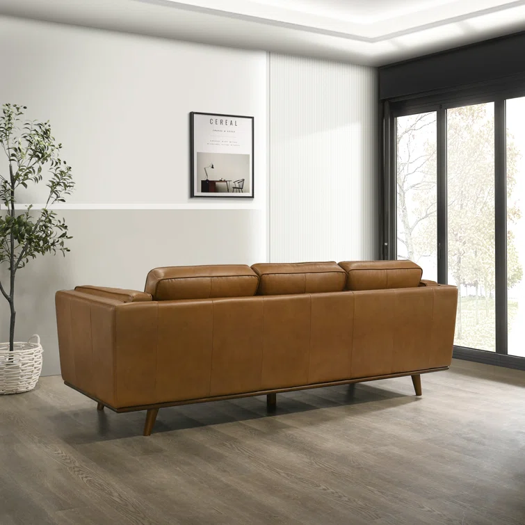 This sleekly upholstered sofa is here to bring a bold mid-century feel to your living room. It has a solid eucalyptus wood frame with a warm walnut finish, and it rests on tapered dowel legs for an elevated look. Wrapped in smooth genuine leather, this couch is also generously padded with foam for just the right amount of support as you sit back and unwind. Flared arms, piped edges, and a loose back complete the overall design.