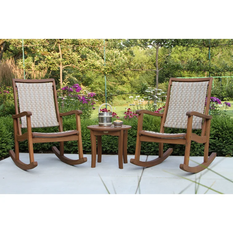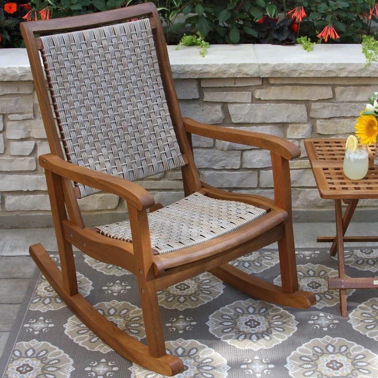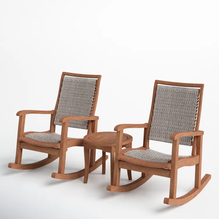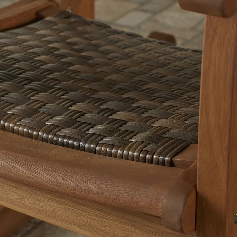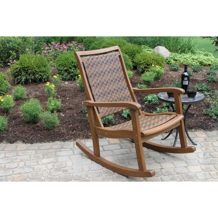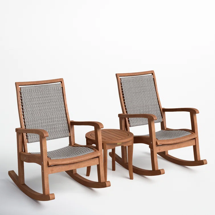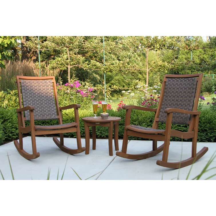 This 3 pieces all-weather resin wicker and eucalyptus set include 2 rocking chairs and a round-end table. The chairs are made from sustainable, plantation-grown eucalyptus hardwood for long-lasting outdoor use and durability in all climates and finished with a beautiful brown umber stain. Being on-trend, we have designed this rocker with our comfortable and carefree HDPE all-weather woven wicker. This combination of materials on the rocker brings incredible comfort and style!