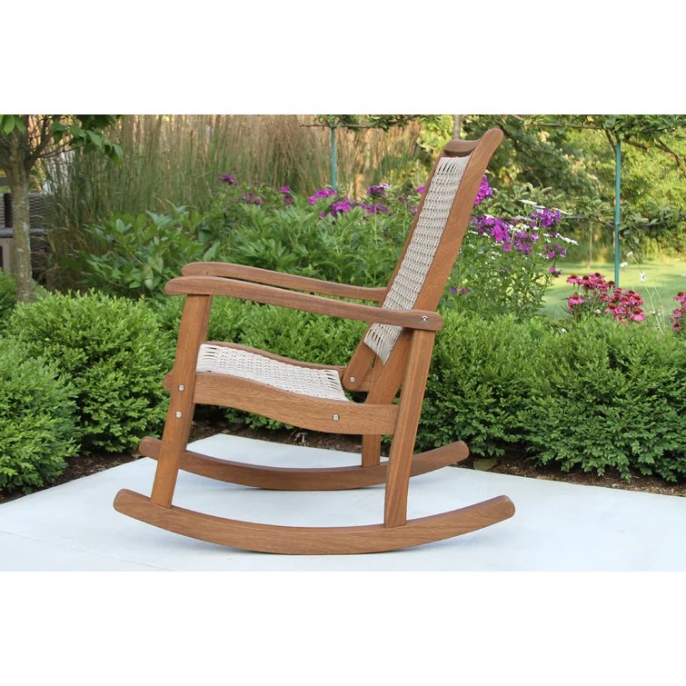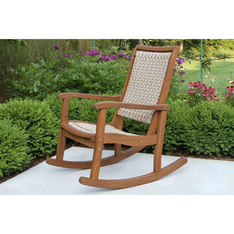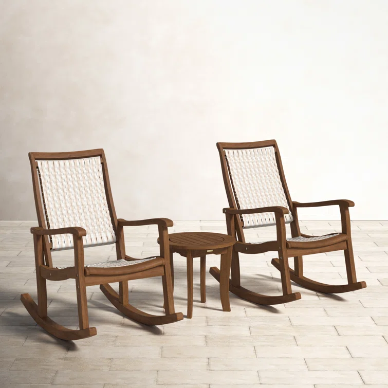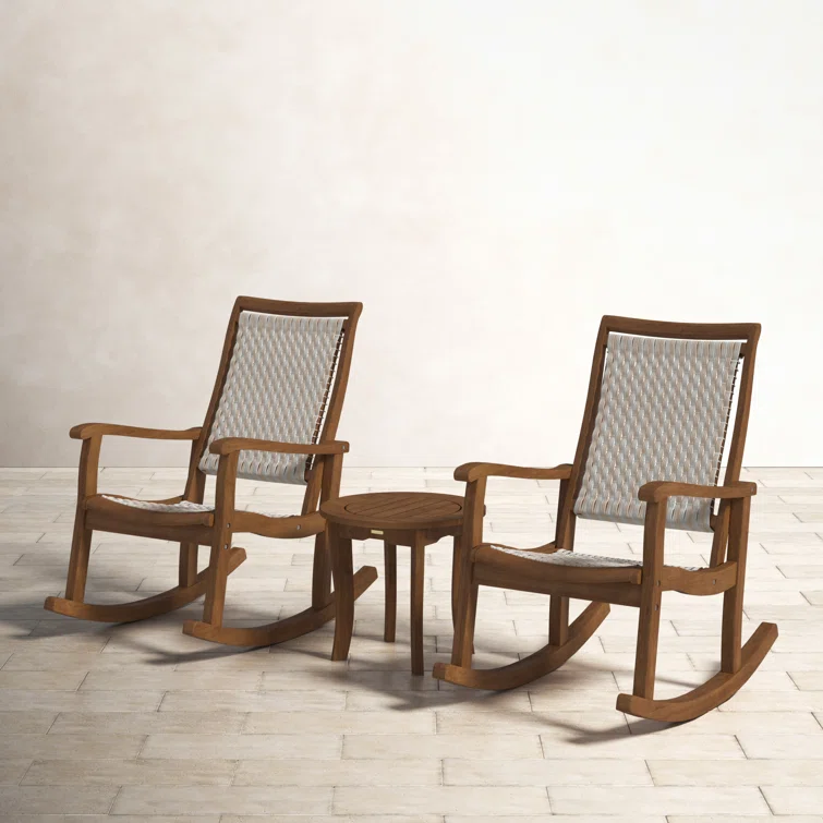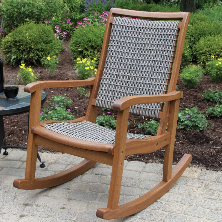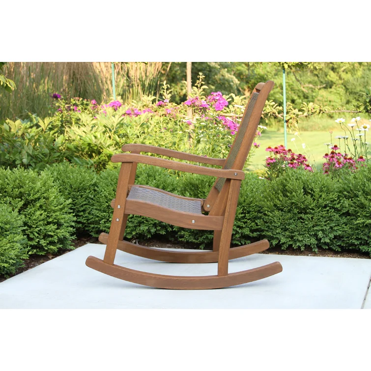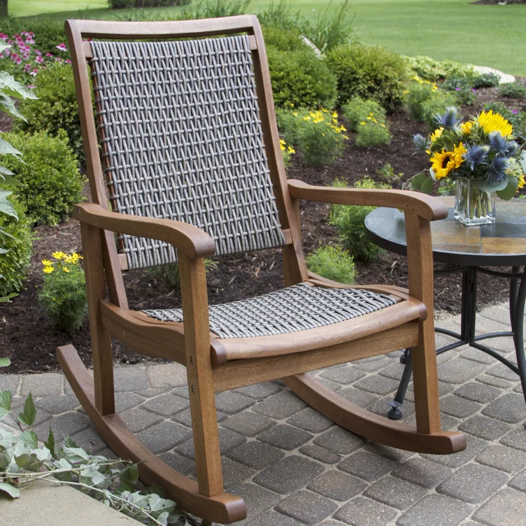 This 3 pieces all-weather resin wicker and eucalyptus set include 2 rocking chairs and a round-end table. The chairs are made from sustainable, plantation-grown eucalyptus hardwood for long-lasting outdoor use and durability in all climates and finished with a beautiful brown umber stain. Being on-trend, we have designed this rocker with our comfortable and carefree HDPE all-weather woven wicker. This combination of materials on the rocker brings incredible comfort and style!