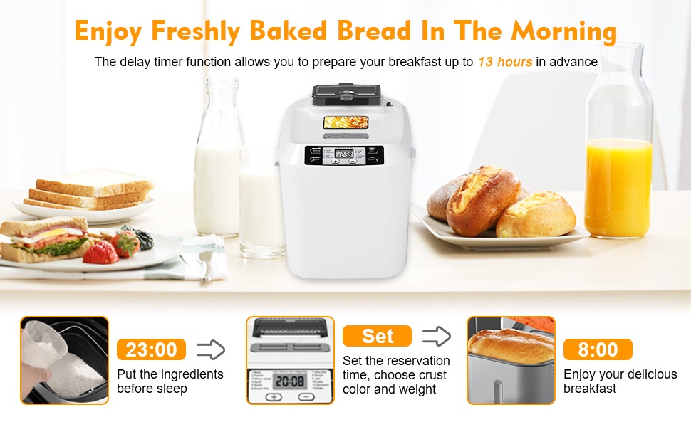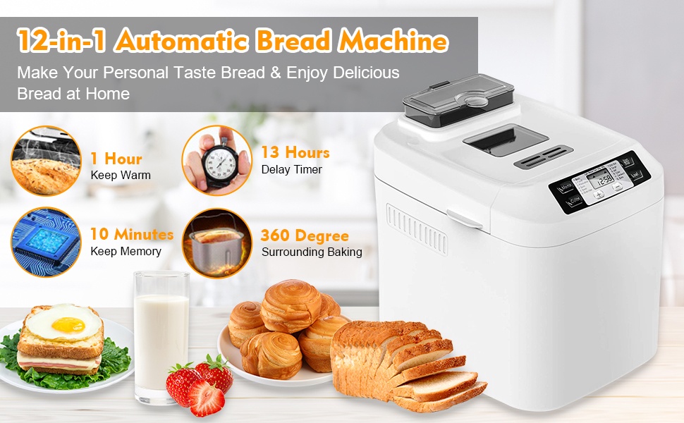 - 13H Tmer & 1H Auomac Warm-Keepng Funcon - The bes bread machne feaures 13-hour delay mer whch means you can se your programmable breadmaker a he end of your busy day and wake up o freshly baked bread for your breakfasYou can se up o 13 hours n advance1 hour keep warm funcon & 10-mnue power nerrupon recovery allows fresh breads anyme homemade bread machne le you enjoy no only aser bu also healher,freshly,easy and asy baked bread every mornng