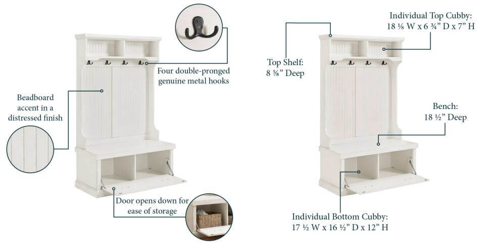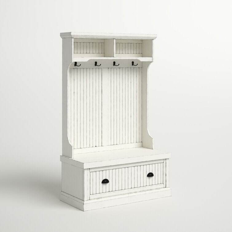 The ultimate organizer, hall trees are a versatile touch for your entryway, that gives you organization, storage, and a handy seat all at once. Take this one, for example: perfect for a classic look, it's crafted from solid and manufactured wood with beadboard panels and a white finish. Four hooks, two open cubbies, and a lower drawer help this piece clear away coats, shoes, and more. And thanks to the built-in bench, this hall tree even lends you a seat while you pull on your boots!
