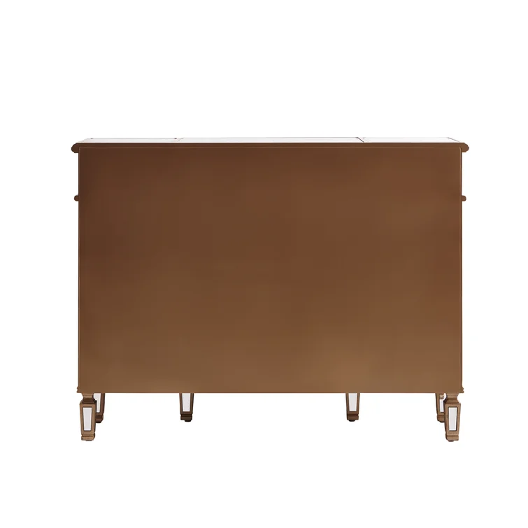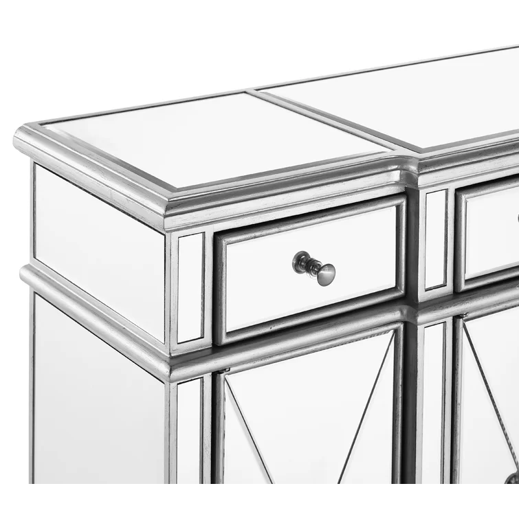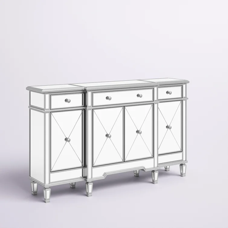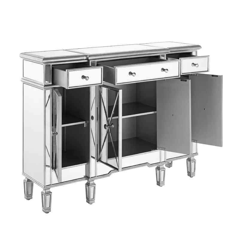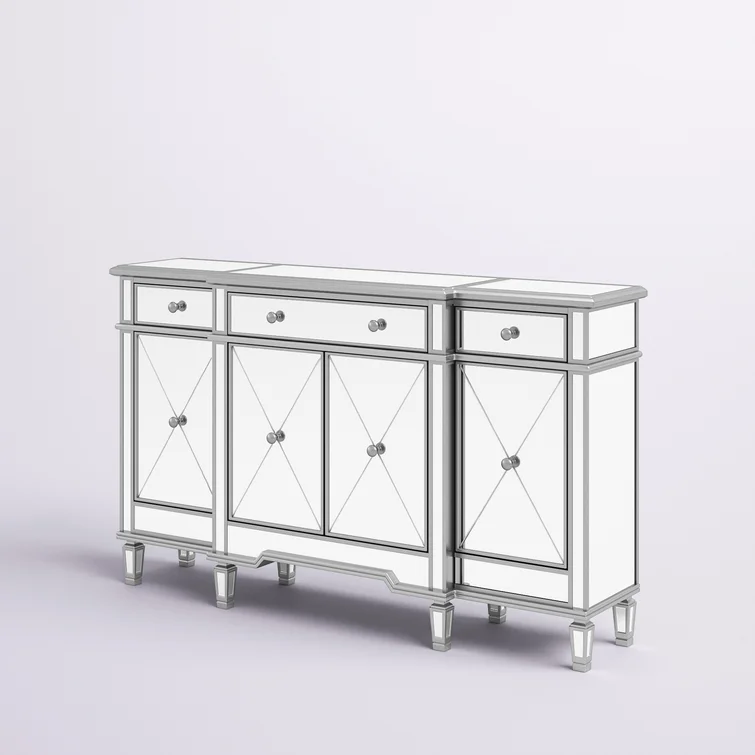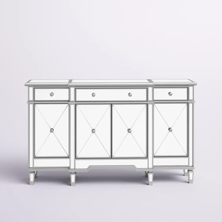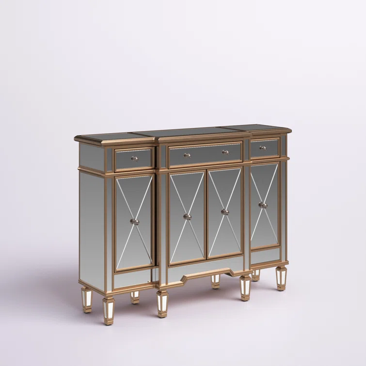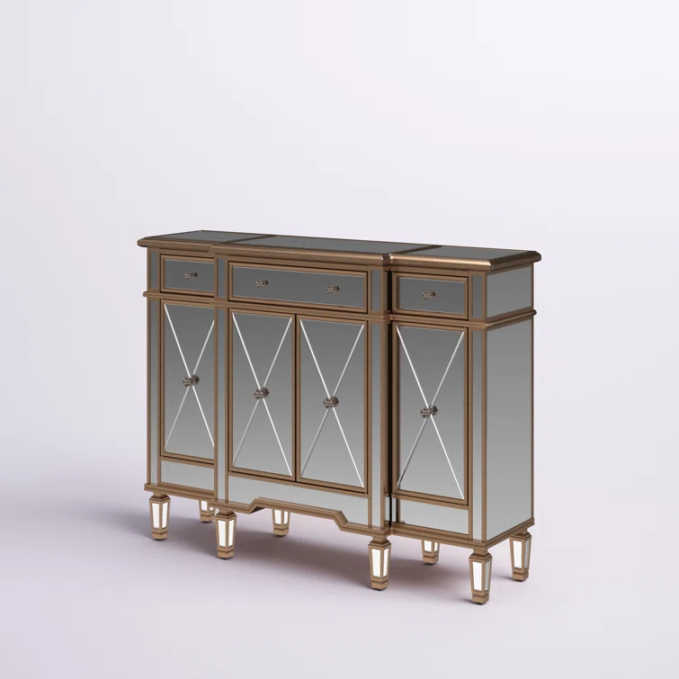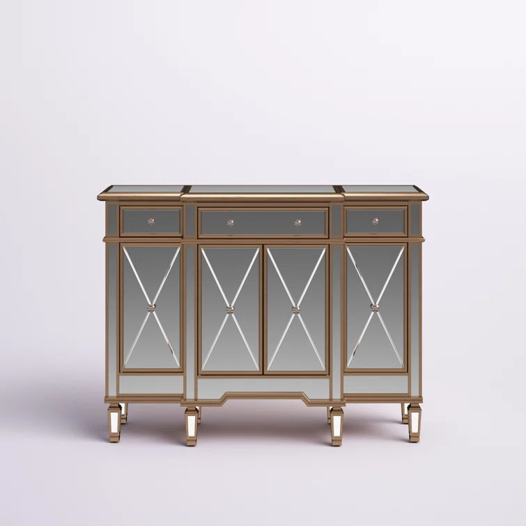 This 3-drawer server is bursting with glamour while also providing ample storage space in your living room or dining room. It's crafted from solid and engineered wood in a metallic finish for some shining contrast. Four tapered feet infuse some mid-century modern charm into this contemporary-inspired piece. Three drawers and four doors reveal a spacious interior with adjustable shelves for your dinnerware, flatware, board games, and seasonal items. Mirrored panels cover all sides of this buffet, bouncing natural light throughout your room to make it feel bright and open.