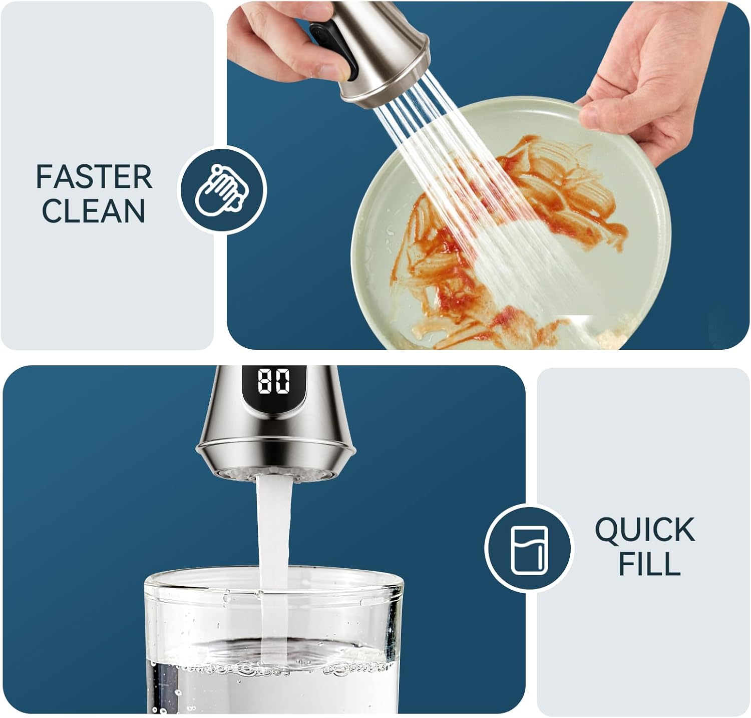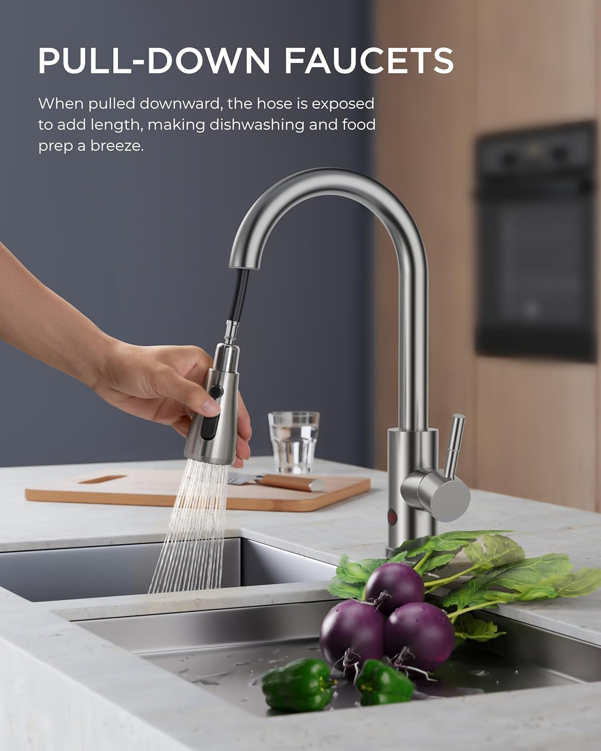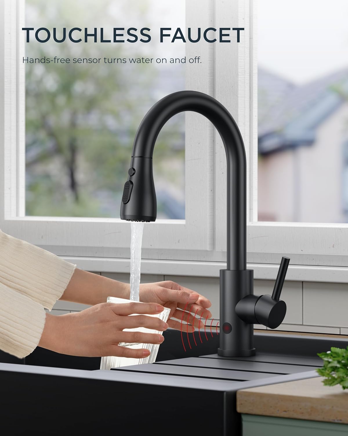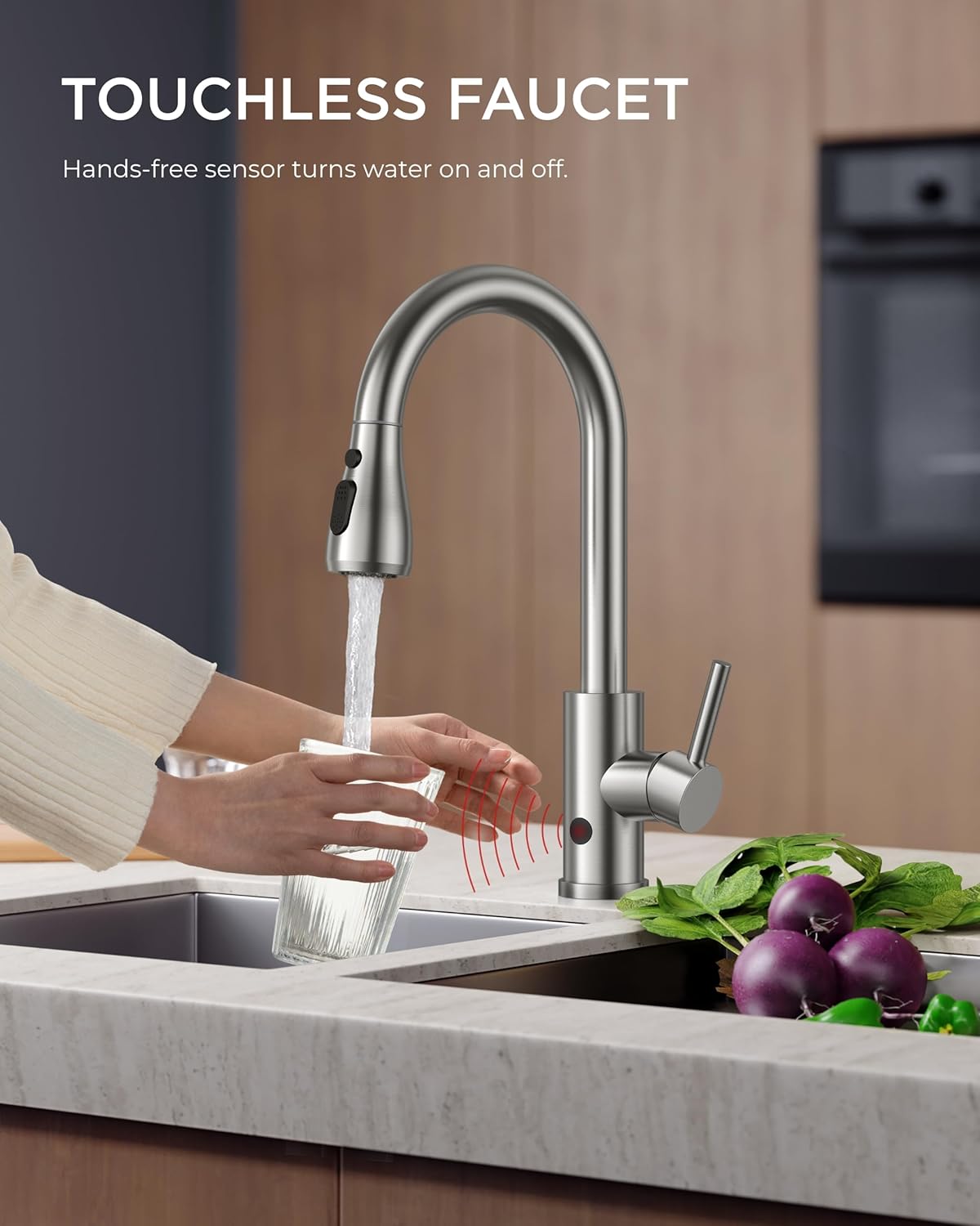 - Smart Touchless Operation: The touchless kitchen faucet features advanced sensor technology for touchless control—just wave your hand to operate when the handle is open. It includes a 3-minute auto-off timer to prevent water waste to prevent water wastage