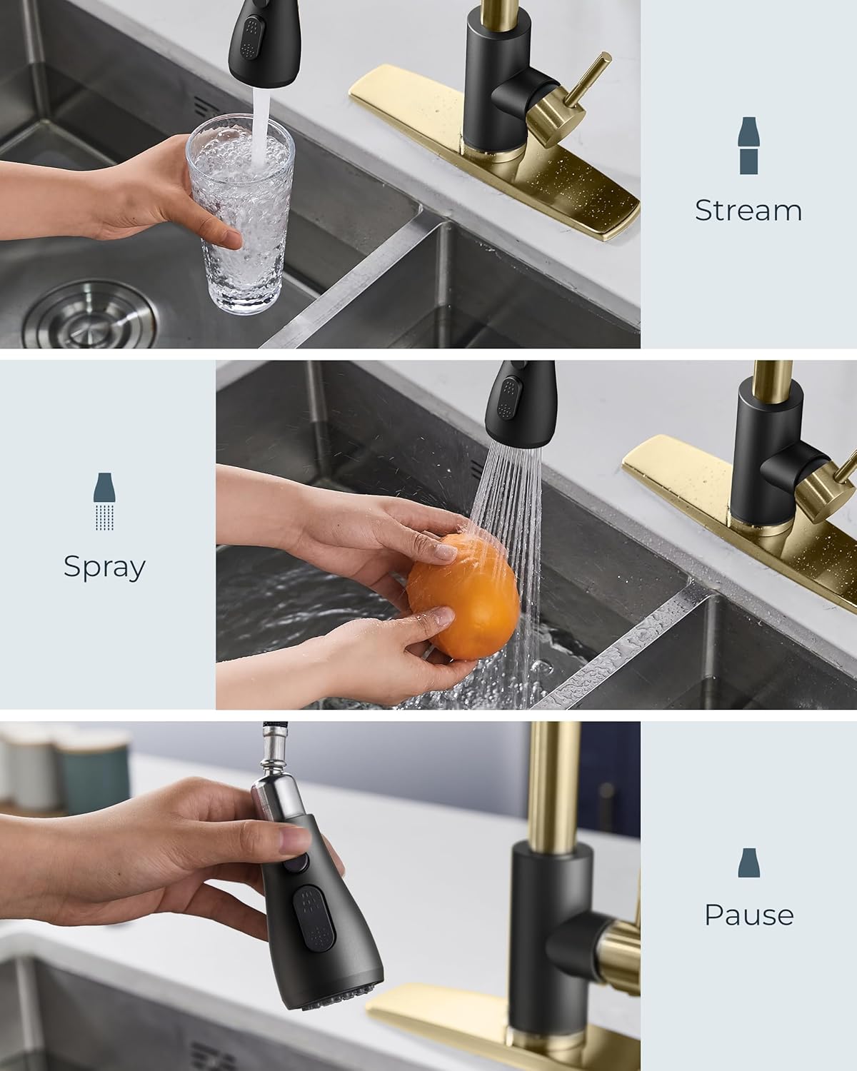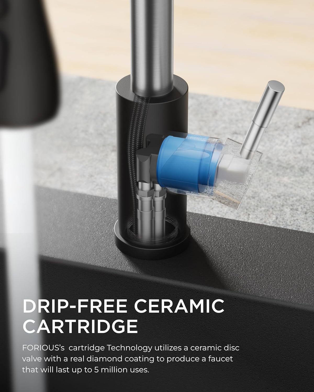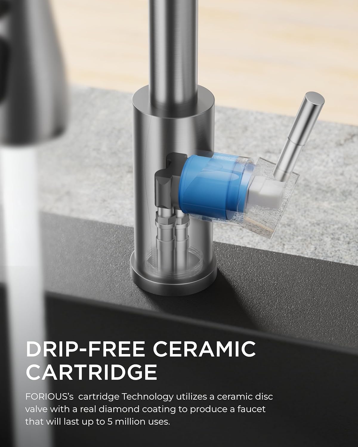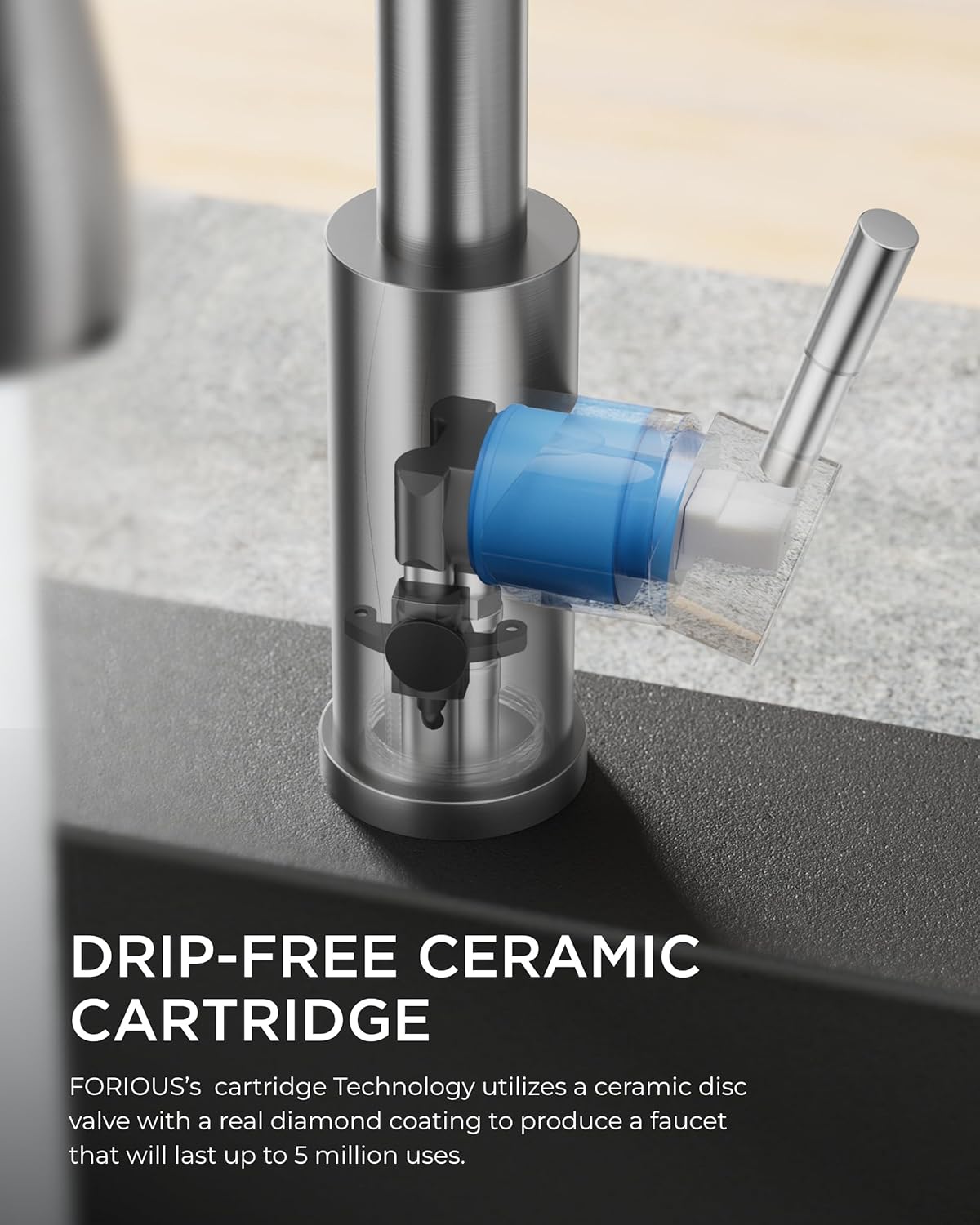 - Versatile Functionality: Our FORIOUS kitchen sink faucet combines three spray settings (Stream, Spray, Pause), a high arc, an 18 inch retractable hose, 360° rotation spray head, and a single handle for efficient sink coverage and effortless control