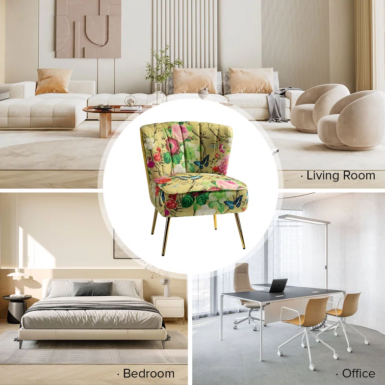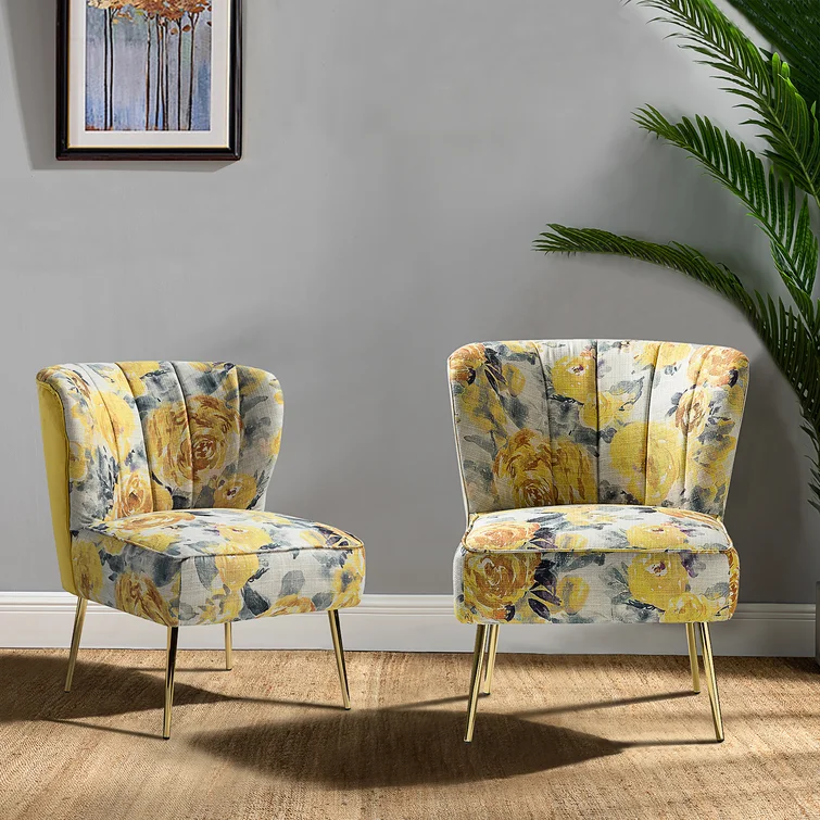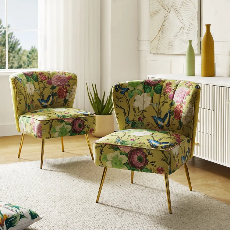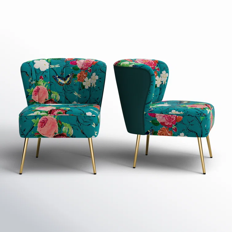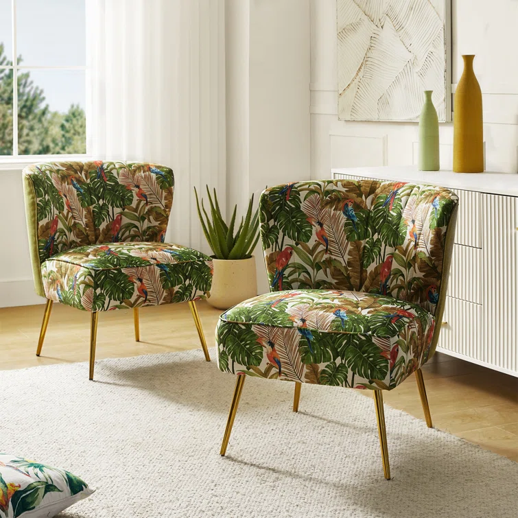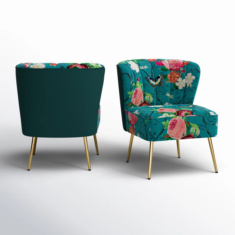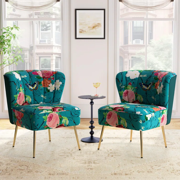 This set of two barrel chairs is full of elegance and glam appeal with patterned upholstery and metal legs. Each piece has a solid and engineered wood frame, resting on iron legs coated in a golden hue that brings a luxe look to your living room or den. We love the velvet upholstery in a selection of colorful patterns that make these barrel chairs stand out in your space. They also feature vertical channel tufting, a foam fill, and sinuous springs in the seats for added support when relaxing with a good book or chatting with a friend.Hand-curated by Kelly Clarkson.