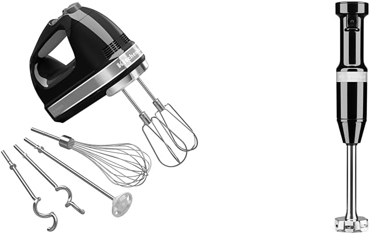This KitchenAid bundle combines a versatile 9-speed hand mixer with a compact food chopper to handle a variety of kitchen tasks. The KitchenAid 9-Speed Digital Hand Mixer features 9 speeds to mix, whip or knead ingredients. Its turbo beater accessories and pro whisk attachment can cream butter, whip egg whites to stiff peaks, and knead yeast dough. Soft start brings the beaters up gradually to prevent splattering. A locking cord stays out of your way during mixing. Complementing the mixer, the 5 Cup KitchenAid Food Chopper quickly chops, whips, mixes, and purees fruits, vegetables, herbs, nuts and more to save time on meal prep. Chop ingredients for salsa, hummus or salad. Puree cooked veggies for baby food or soup bases. Whisk cream in 30 seconds. An included drizzle basin lets you easily make dressings and sauces. With two speeds, pulse function, and stainless steel multi-purpose blade, this compact chopper delivers coarse or fine results as needed. Together these KitchenAid appliances cover a wide range of everyday mixing, chopping and prep tasks. Their space-saving sizes tuck neatly into storage between uses.