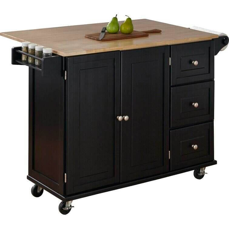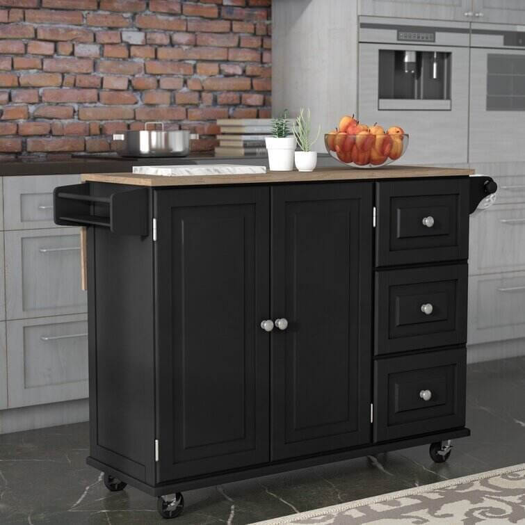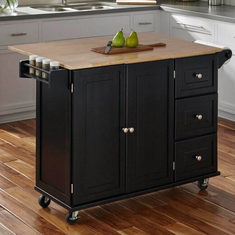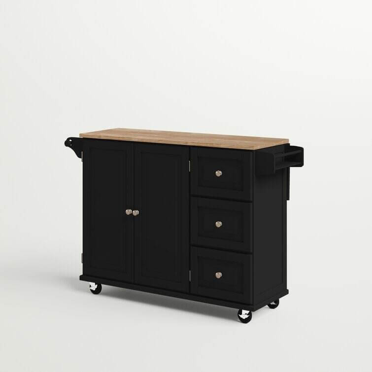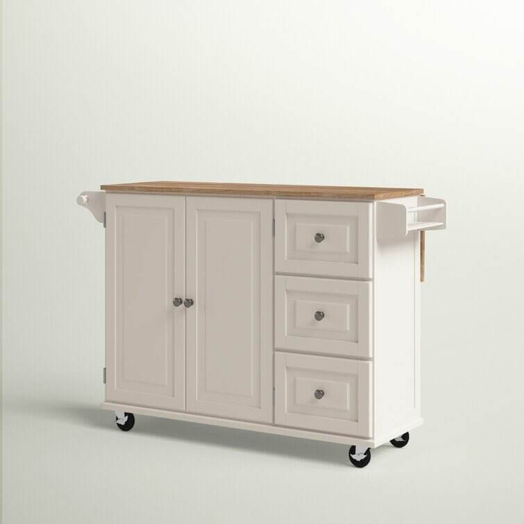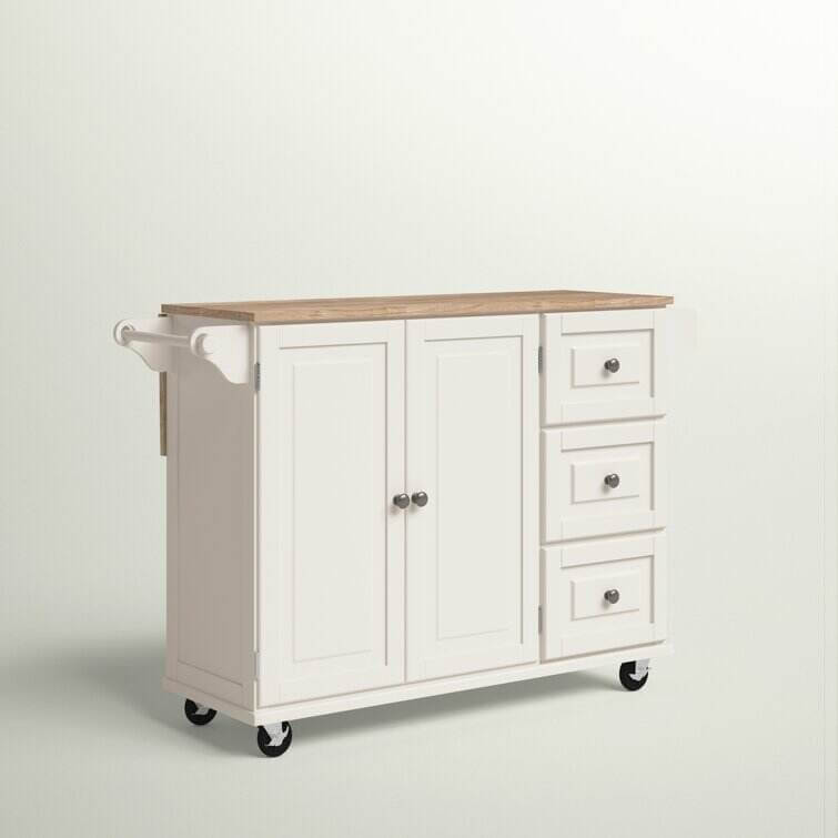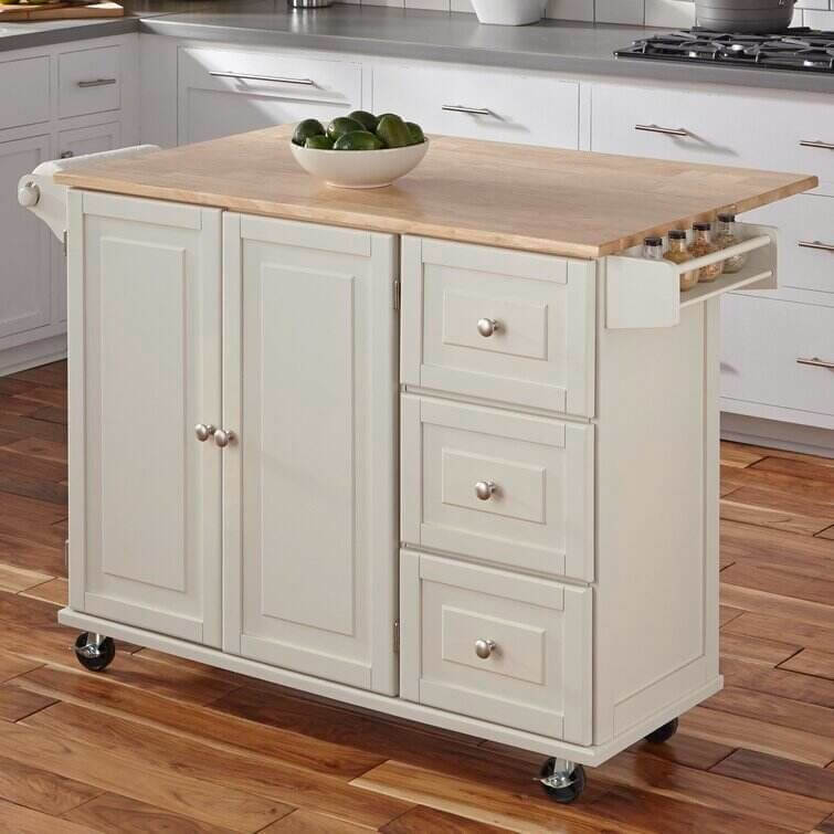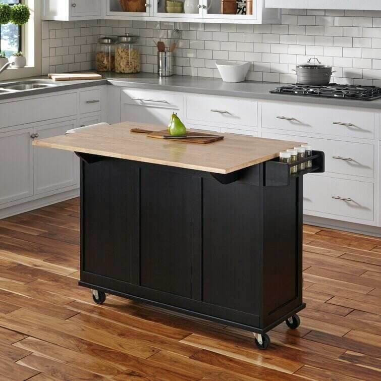 Bring both function and style to your kitchen with this understated island, the perfect anchor for your arrangement. Its clean lines and wood top pair together to give this design a traditional look that blends effortlessly into any aesthetic. Use its ample storage space to stow kitchen essentials including dry ingredients, flatware, spices, and more. Its solid rubberwood top is perfect for prepping meals or displaying a vase of romantic roses. Use its drop-leaf function to craft a breakfast bar in your kitchen or to maximize your prep space. With its wheeled design and towel rack, this versatile design is a must-have addition to your kitchen ensemble.