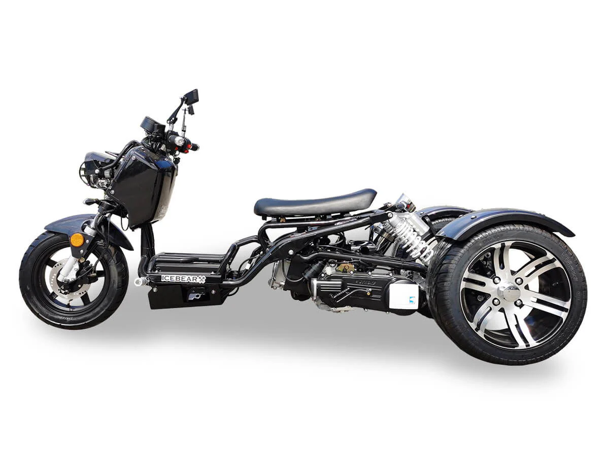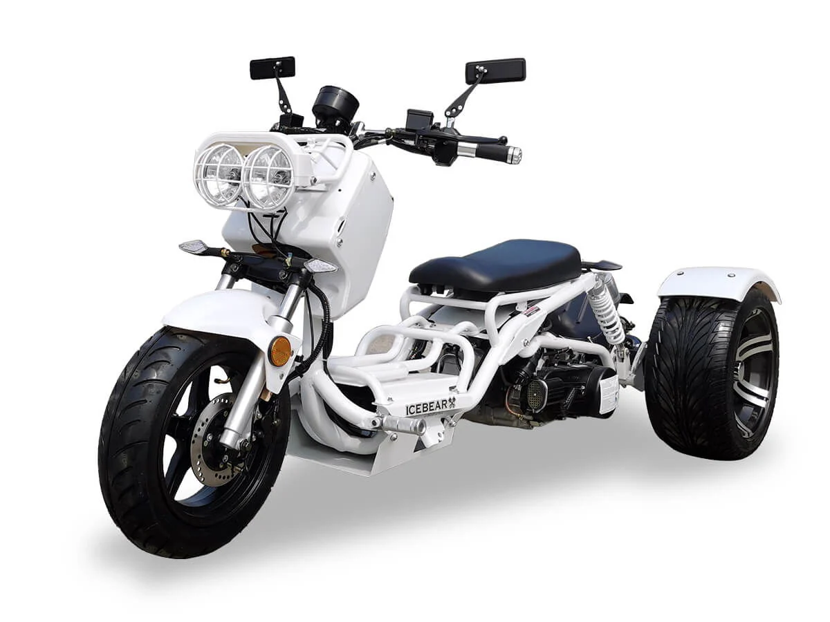 The IceBear PST150-19N 150cc Maddog Trike is an efficient way to get around wrapped in classic Honda Ruckus style! The 150cc air-cooled engine has more than enough power to handle inner city commutes with ease, and you can ride hassle-free with a reliable electric starter and an automatic CVT transmission. The retro rat rod body with exposed frame is supported by a full suspension setup with dual rear shocks. Dual hydraulic disc brakes and super-wide tires provide serious stopping power you can count on! Features also include a full set of gauges on the dash, turn signals, side mirrors, and bright LED headlights. The Maddog trike is sure to turn heads with it's upswept muffler and rat rod style! EPA approved and CARB exempt. Great selection of colors!