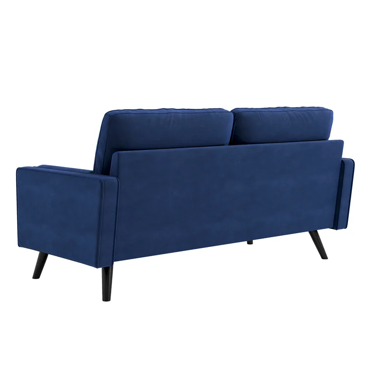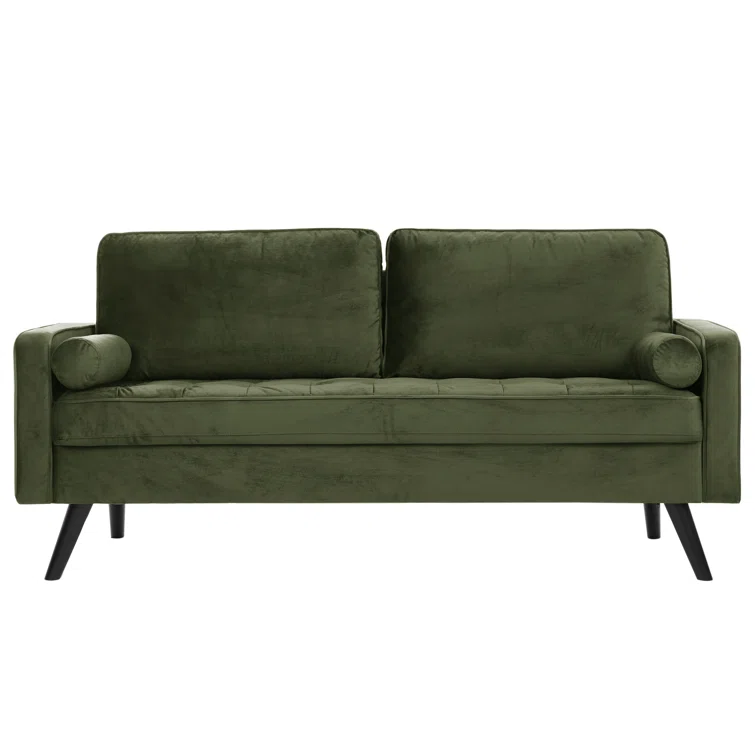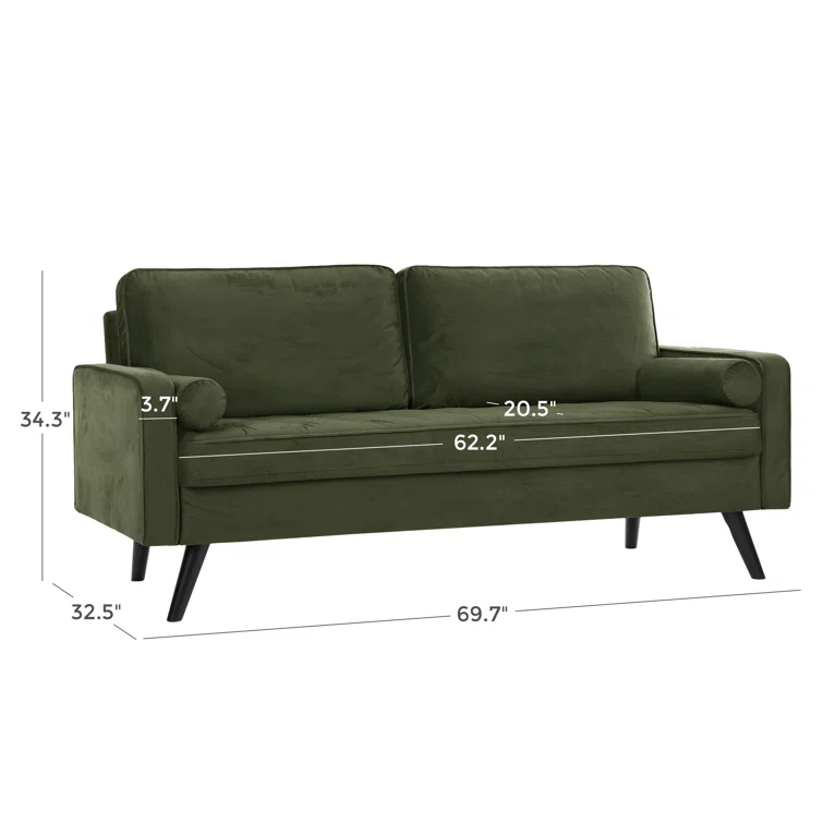 Add a splash of mid-century modern flair to your living room or den with this sofa. Its low-profile design is made with a solid eucalyptus wood frame, and it's built on flared, tapered legs for a sleek look. This 69.7" wide sofa features square arms and a square back that's upholstered with tear-resistant velvet. It's also topped with foam-filled cushions for a supported seat during movie or game nights with your besties. Best of all, this sofa comes with two cotton-filled throw pillows for an extra layer of texture in your space. All the tools you need for fuss-free assembly are included, so there's no need to break out the toolbelt.
