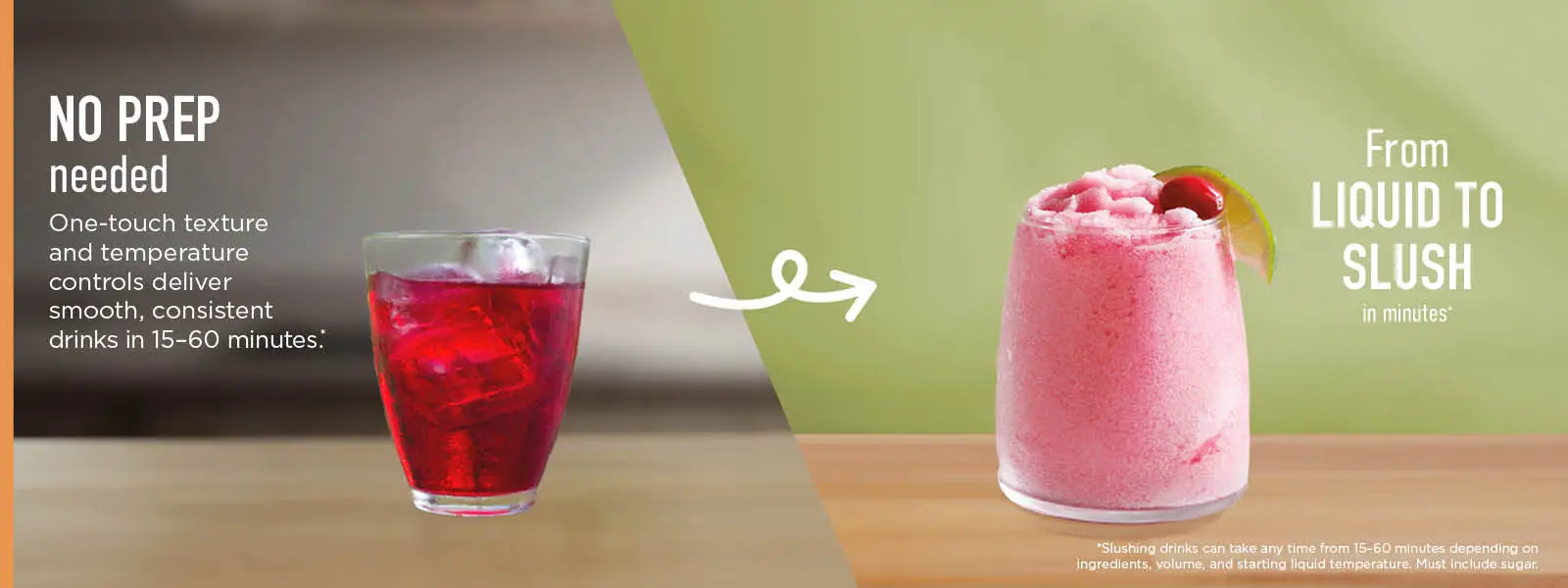 Easy-fill vesselEasy to fill up, top off, and remove for cleaning. Creates slush quickly and keeps drinks frozen for up to 12 hours.*
