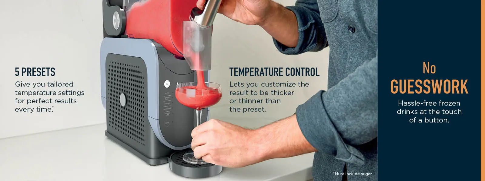 5 preset settings: Slush, Spiked Slush, Frappé, Milkshake, Frozen Juice. Temperature control lets you customize whether you want the output to be thicker or thinner than the preset.