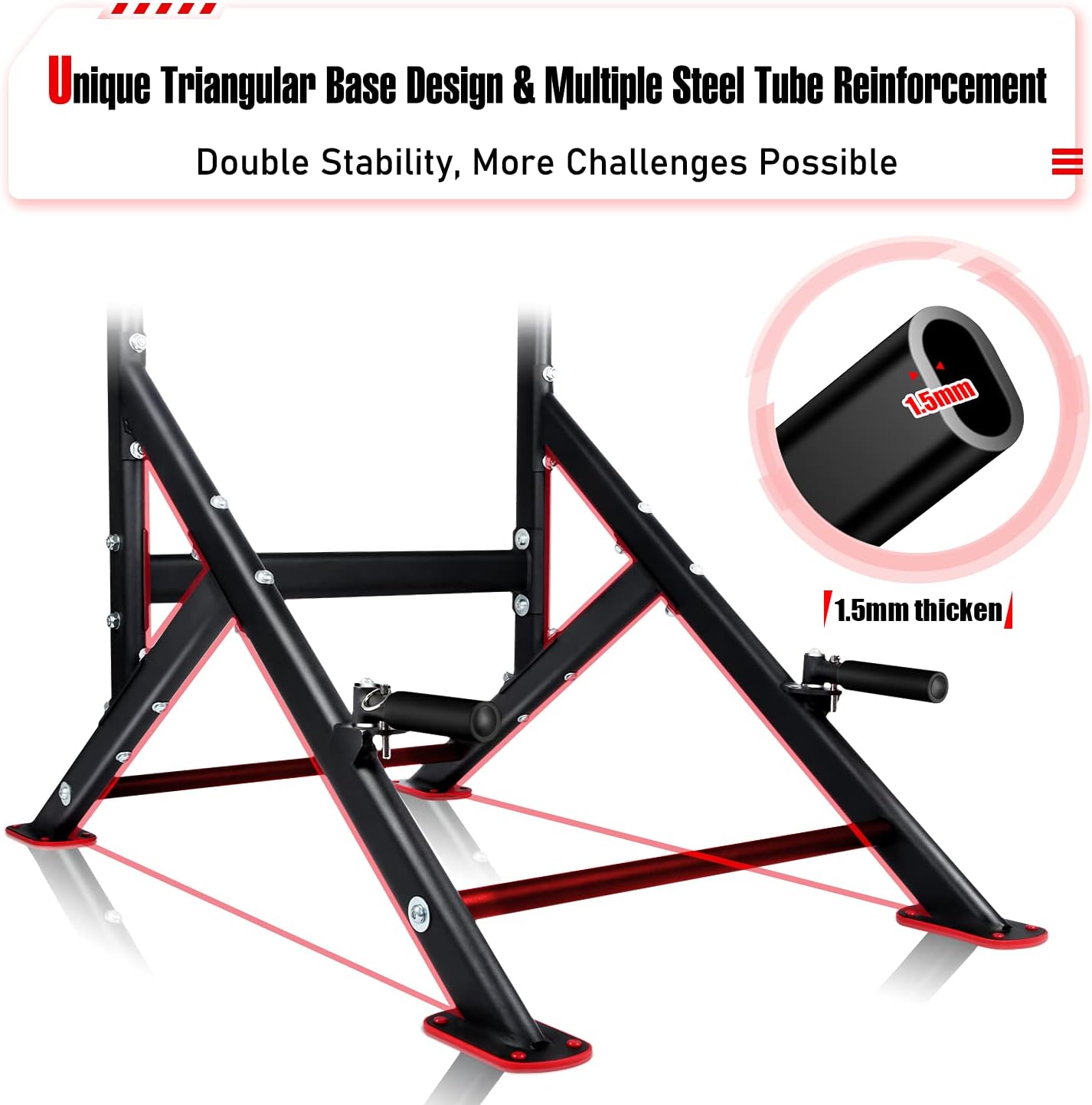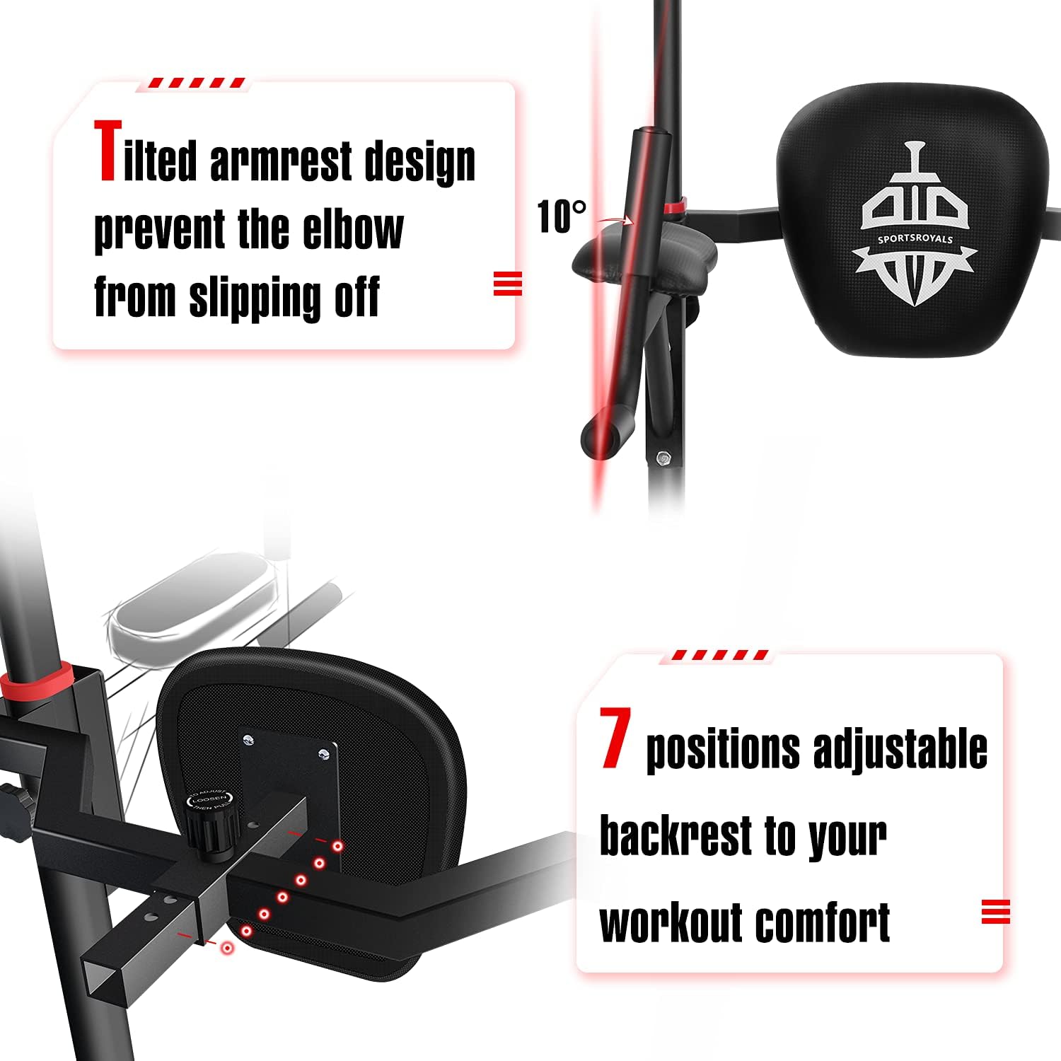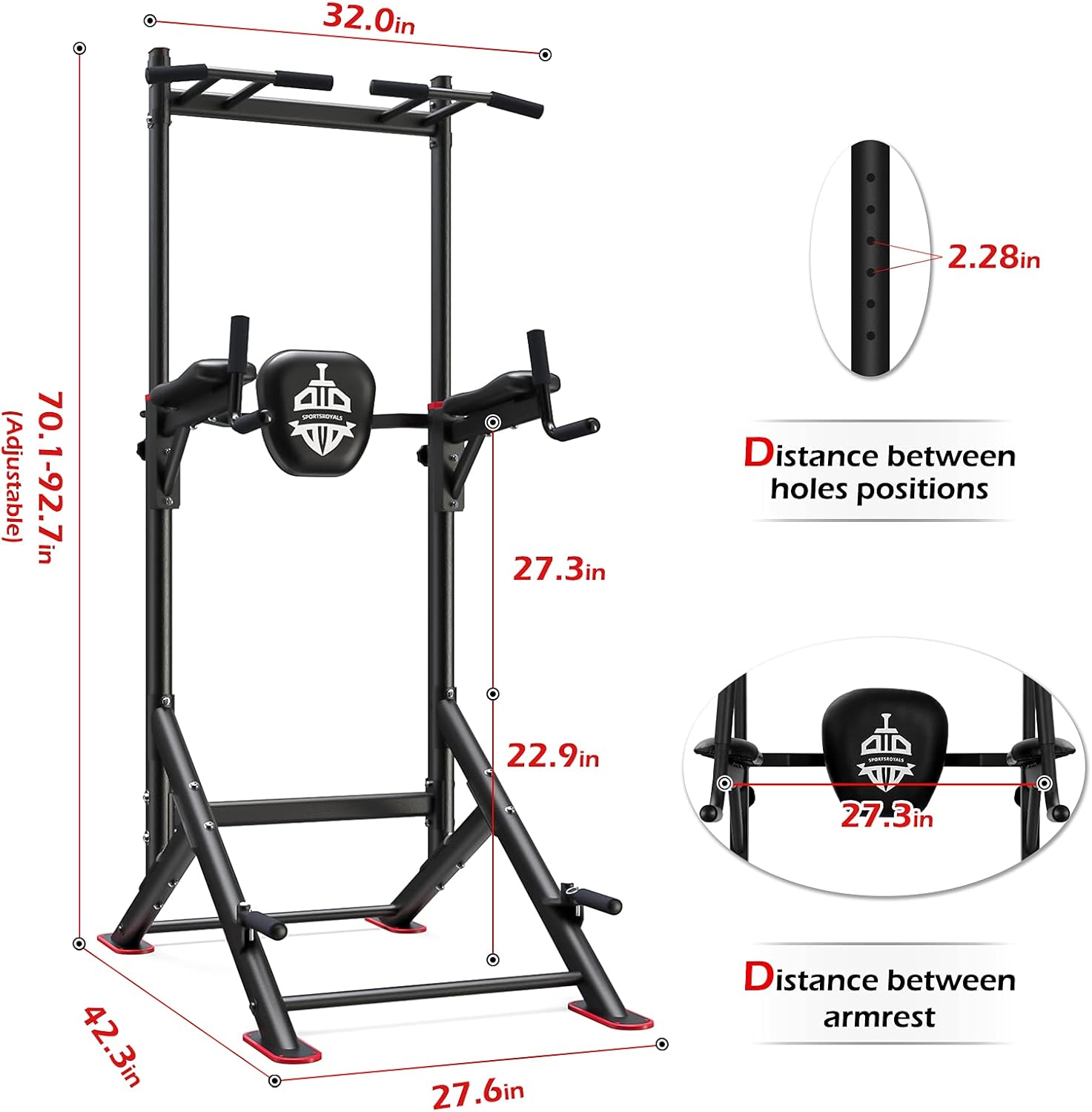 - 【Double Stability】Sportsroyals Power Tower adapt unique dual-triangular base in both side instead of original H-shape base, which guarantee the further stability when you workout. Combine with 3 crossbars reinforcement make this dip station more firmly, such a high-firmness let more chanllenges possible.