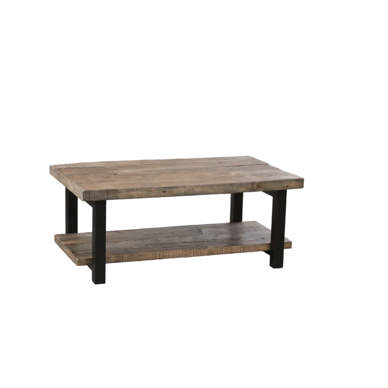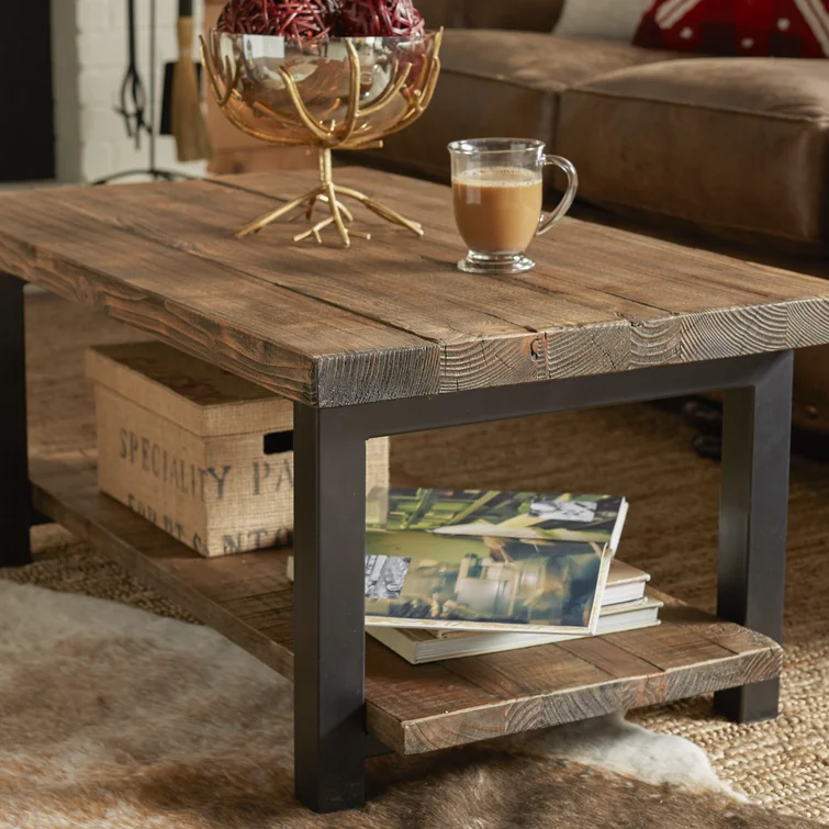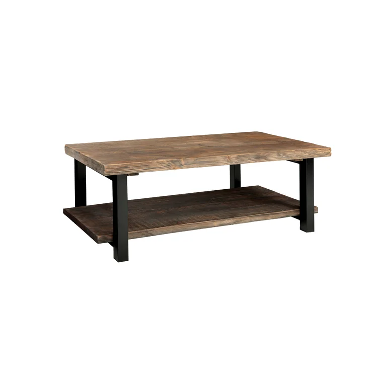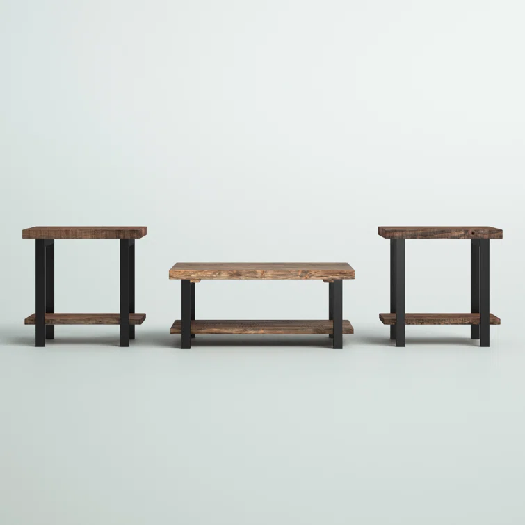 This 3-piece coffee table set gives you plenty of space for storage and display while bringing rustic and industrial elements into your living room. It includes a coffee table and two end tables, all of them showcasing a black powder-coated steel base that supports a tabletop and lower wood shelf. These surfaces are made from reclaimed solid pine wood for a lodge-inspired look. We love the noticeable wood grain and the rich natural finish that contrasts with the base. Full assembly is required, with all tools included.