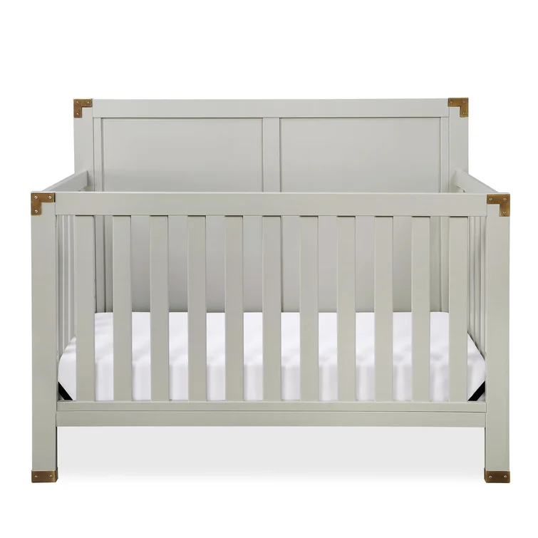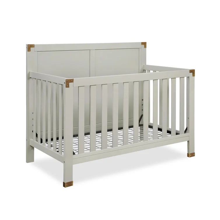 - Modern crib design: Elevated back panel with brass metal plated corner and leg accents. Made from solid pine wood, its chic design provides a timeless backdrop to contemporary nursery decors fit for boys or girls.
